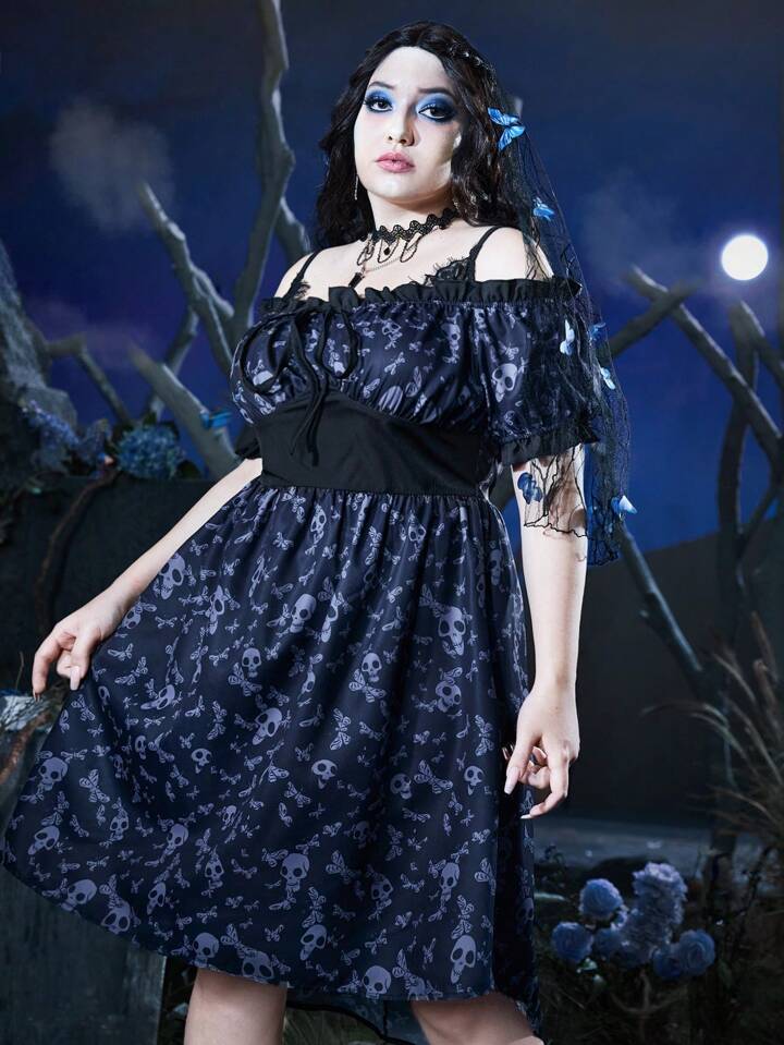 Corpse Bride | ROMWE Taglie Forti Abiti con stampa teschi con spalle scoperte con nodo frontale