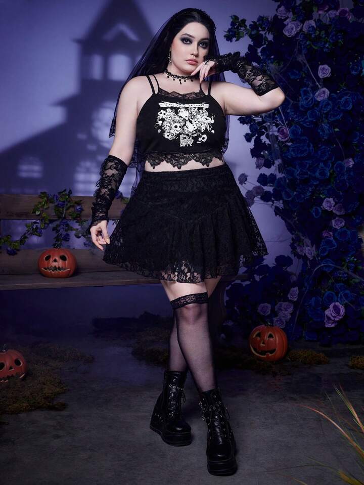 Corpse Bride | ROMWE Taglie Forti Top bretelle sottile con stampa teschi pizzo a contrasto