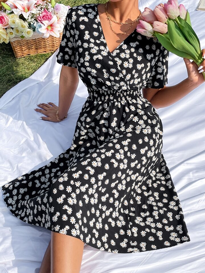 Abiti con stampa margherita scollo sovrapposto vita arricciata