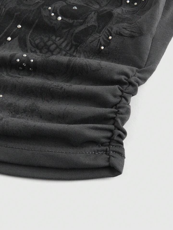 Goth Top senza spalline donna con elementi di teschi gotici scuri e rose tinti con decorazioni di strass