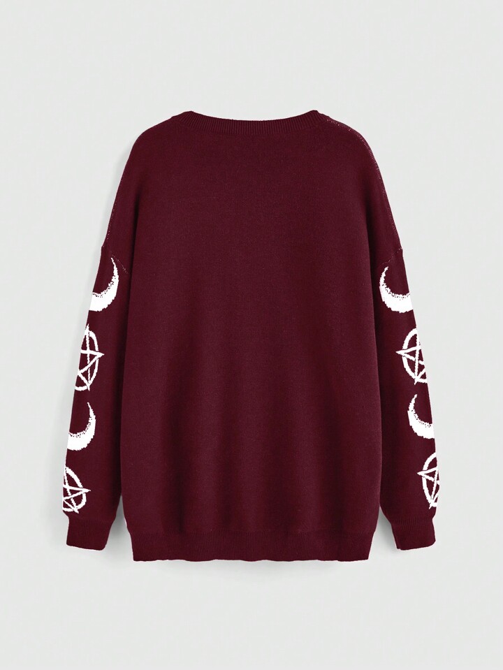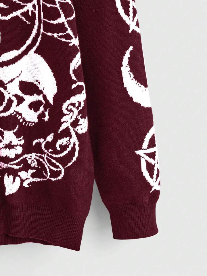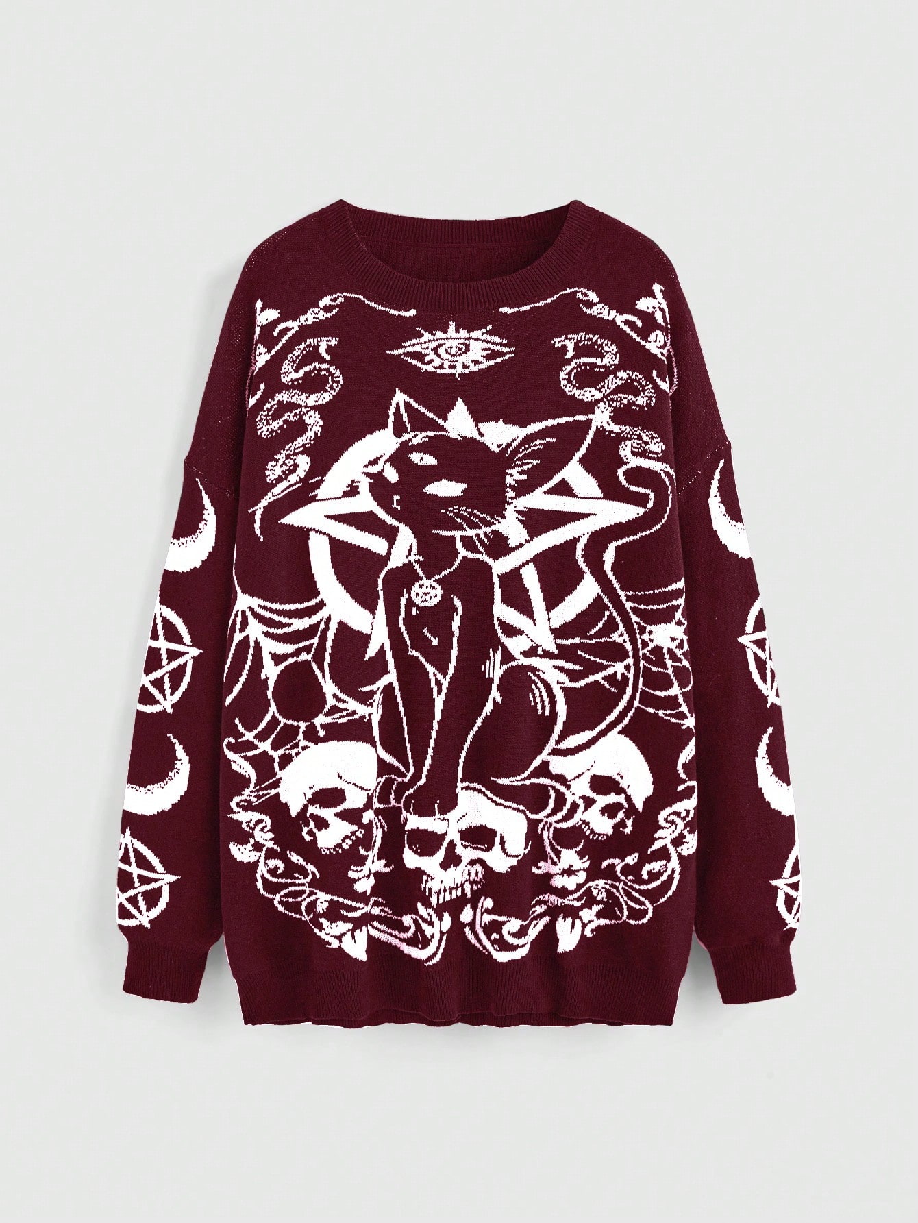 Goth Maglione oversize in jacquard con motivi gotici neri di gatto, teschio, stelle, luna e serpente, adatto per Ognissanti