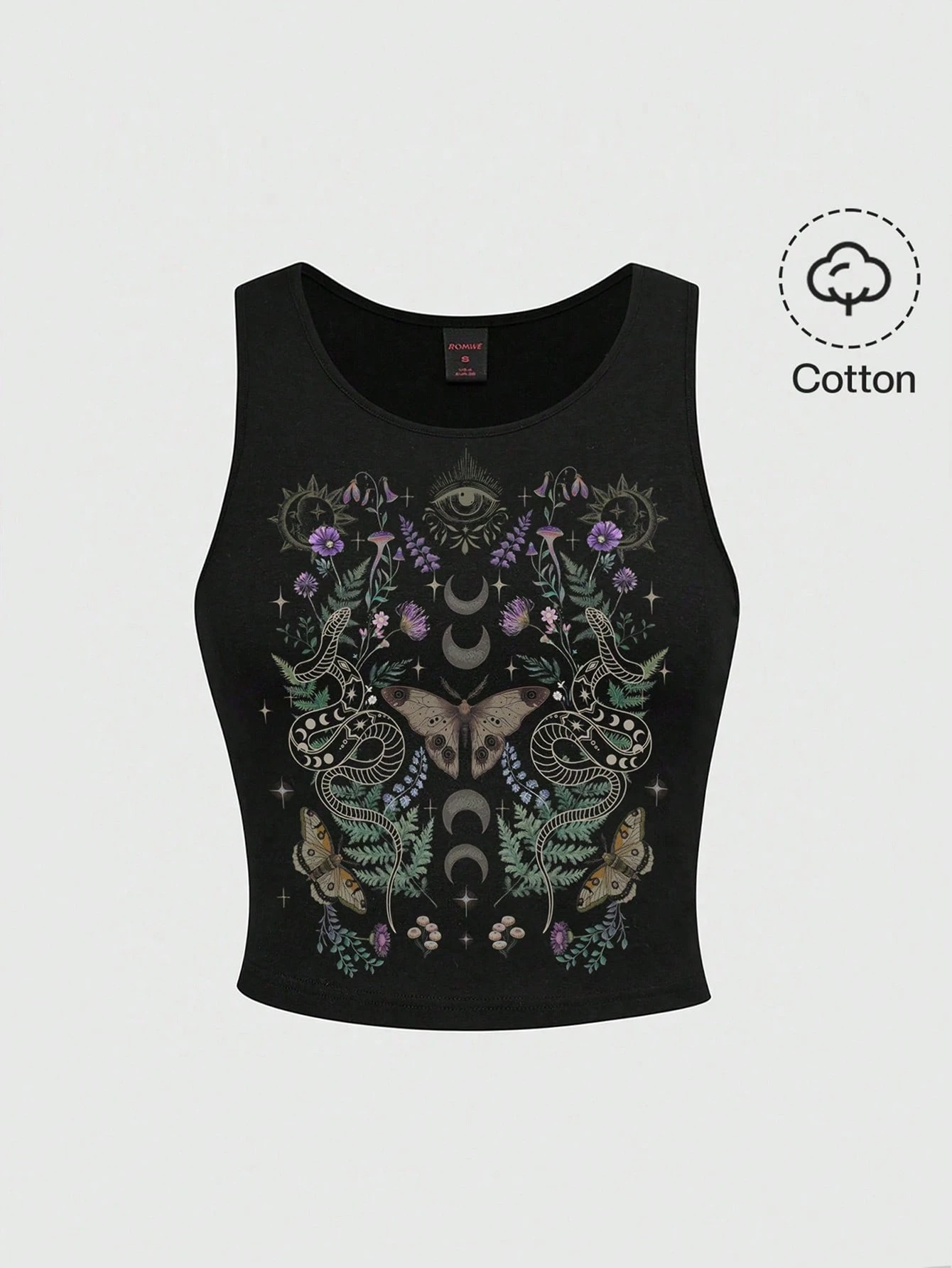 Goth Canotta nera senza maniche da donna con motivi gotici misteriosi di farfalle, pipistrelli, sole, luna, stelle e piante, in stile hippie e da strega