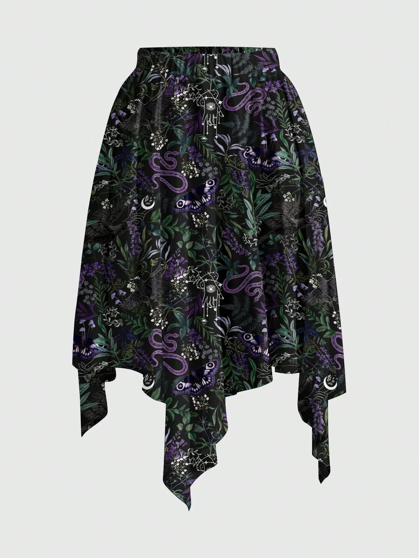 Goth Gonna asimmetrica da donna in stile gotico, con stampa di pianta serpente, aquila e motivi hippie