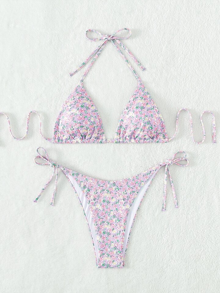 Set bikini estivo a triangolo con stampa fiori Ditsy e legacci laterali