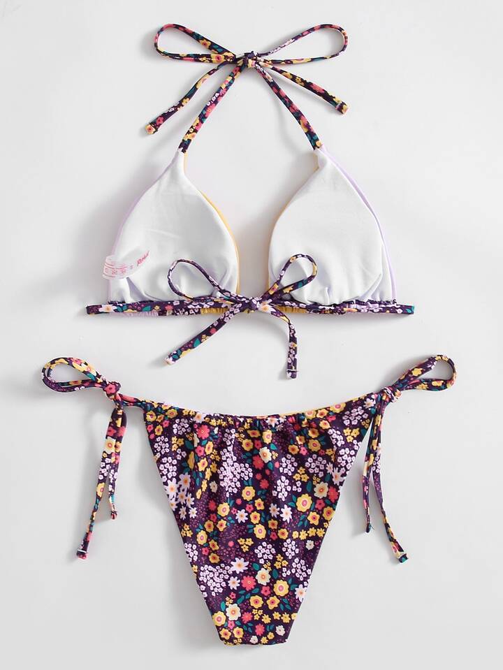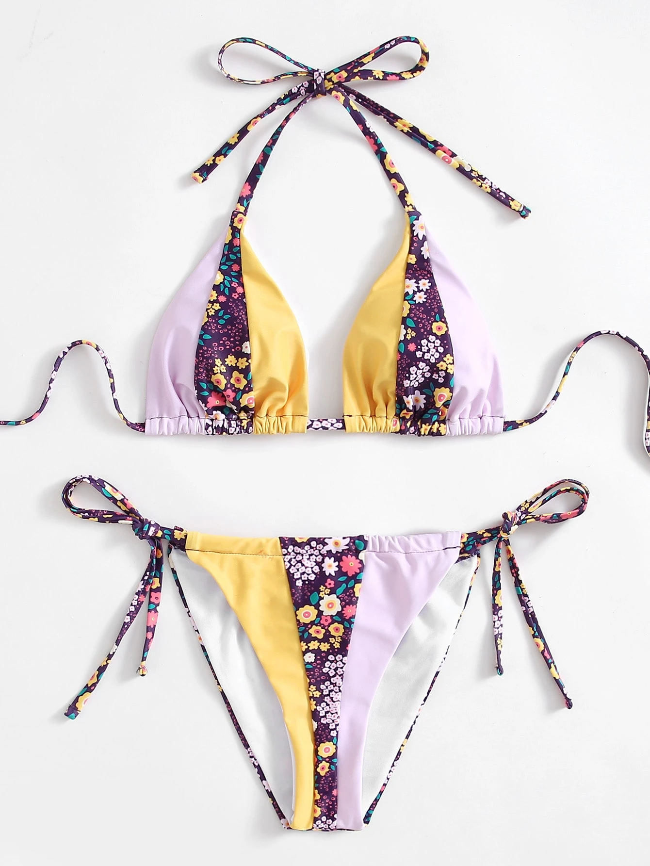 Set Bikini Ditsy Flower Colorblock Halter Taglio Alto Summer Beach