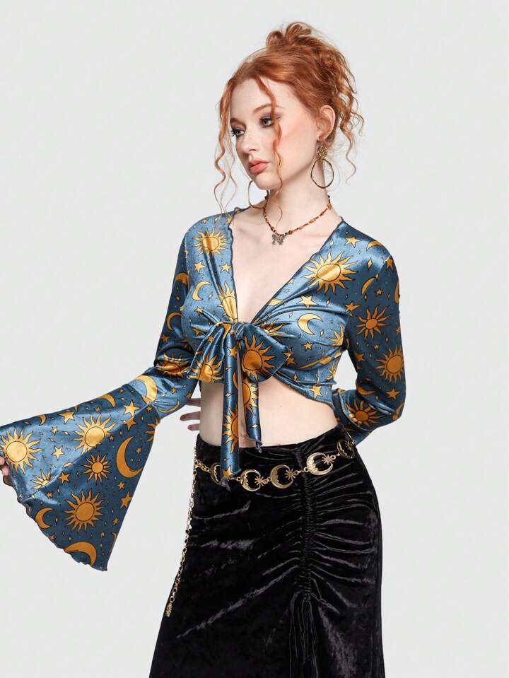 DoodlebyMeg Top con stampa sole e Luna con nodo frontale manica a campana