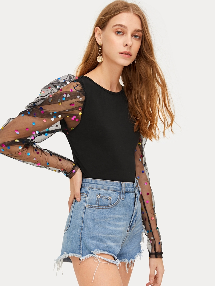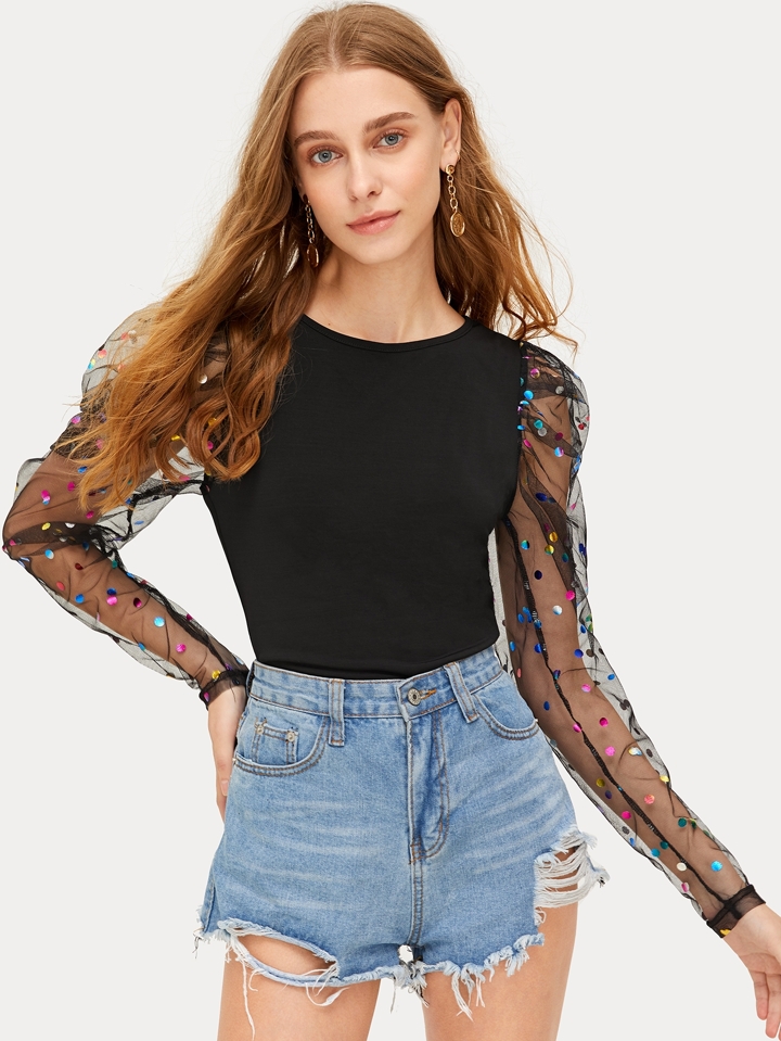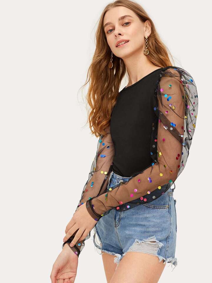 Maglietta skinny con manica a sbuffo in tulle a pois