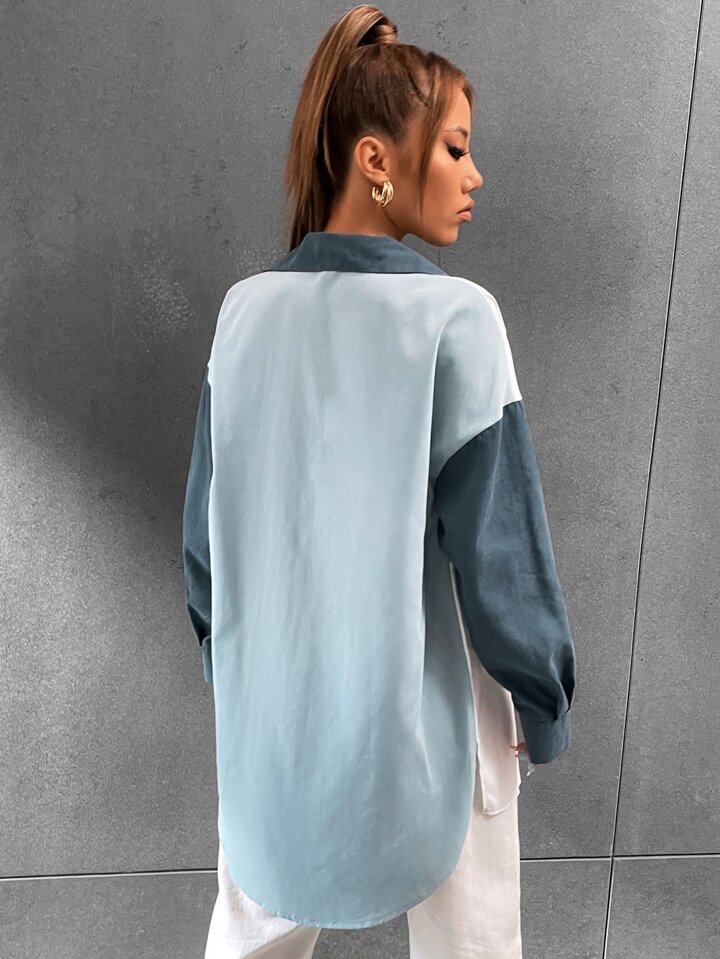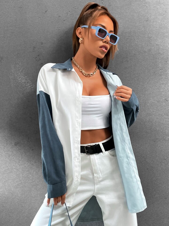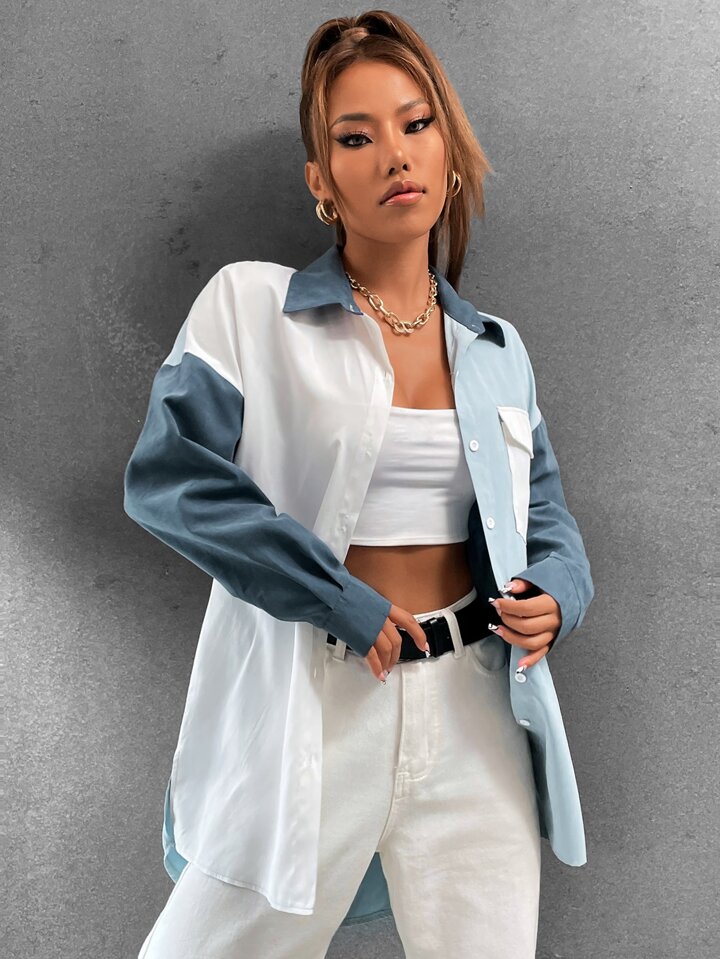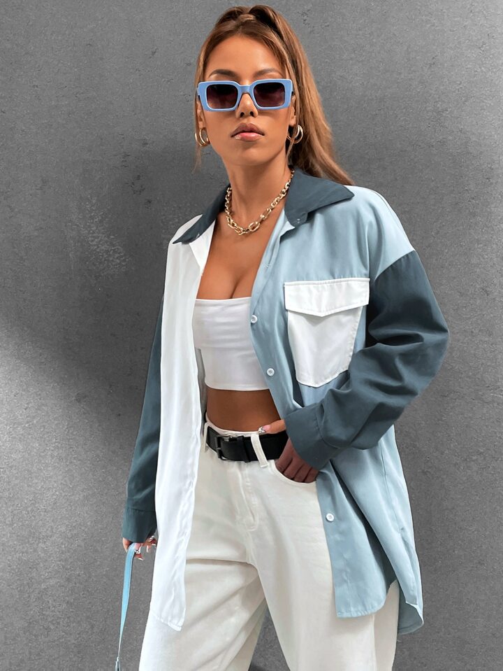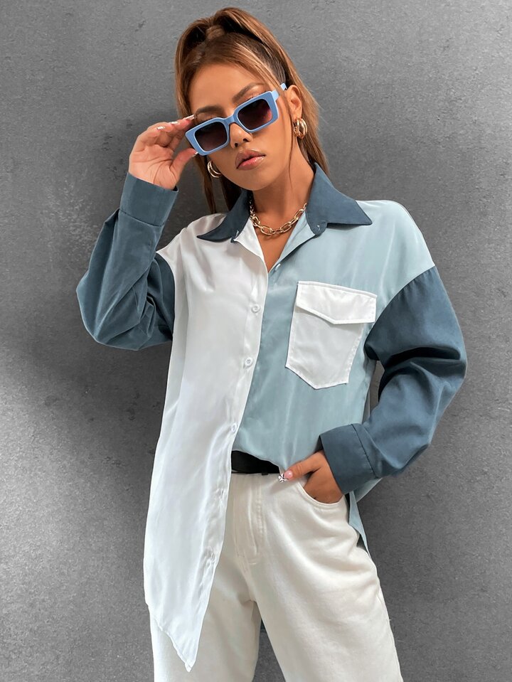 Camicia donna con spalle scoperte, blocchi di colore, grafica, tasche con patta