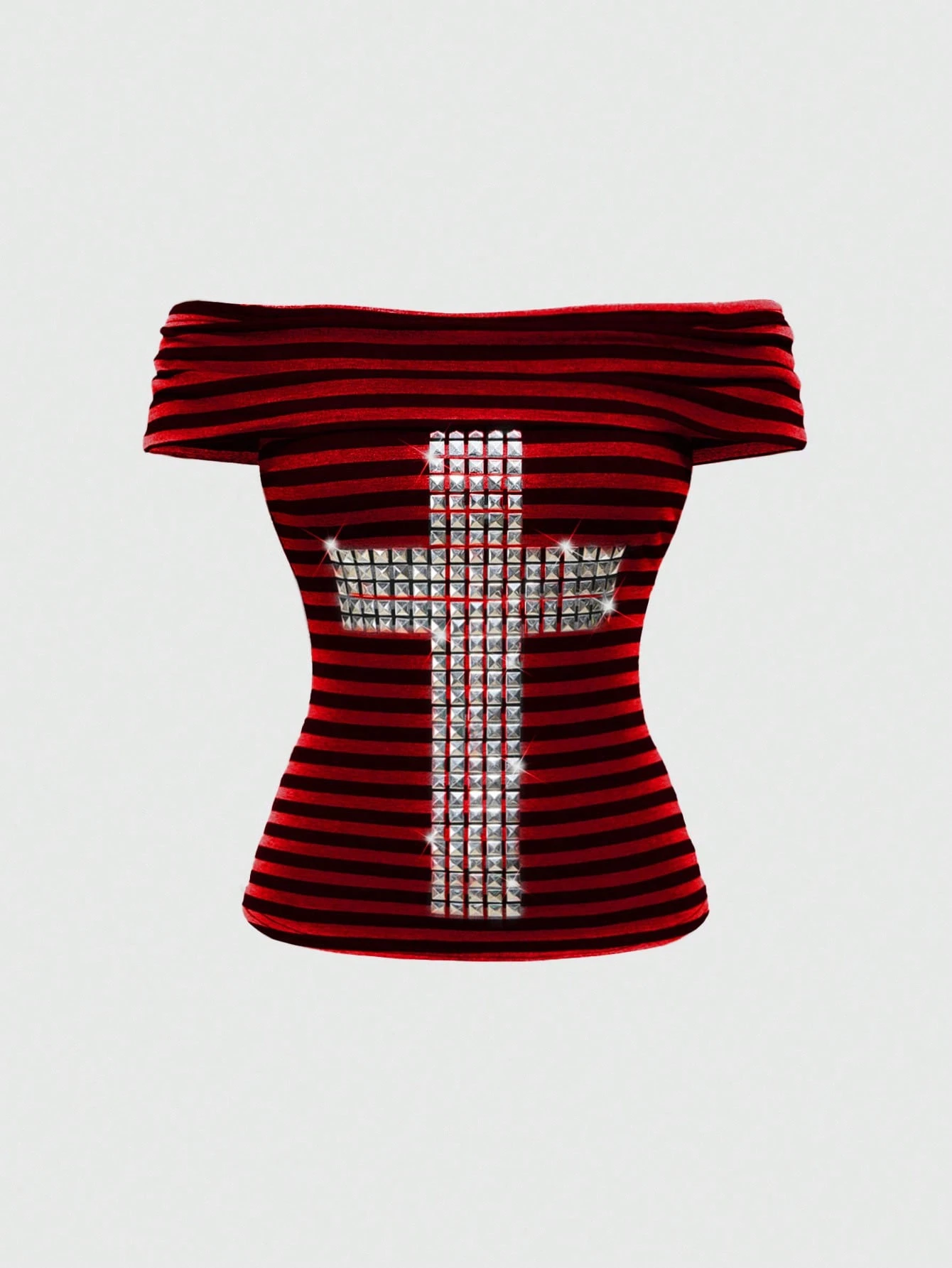 EDITION Maglietta aderente da donna stile punk sexy Y2K a righe con borchie e croce