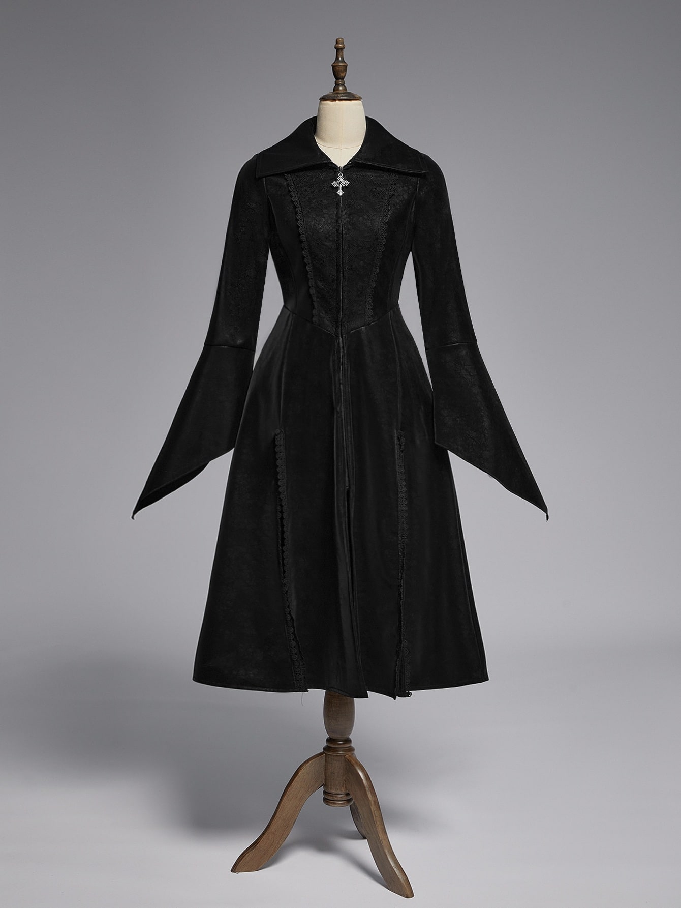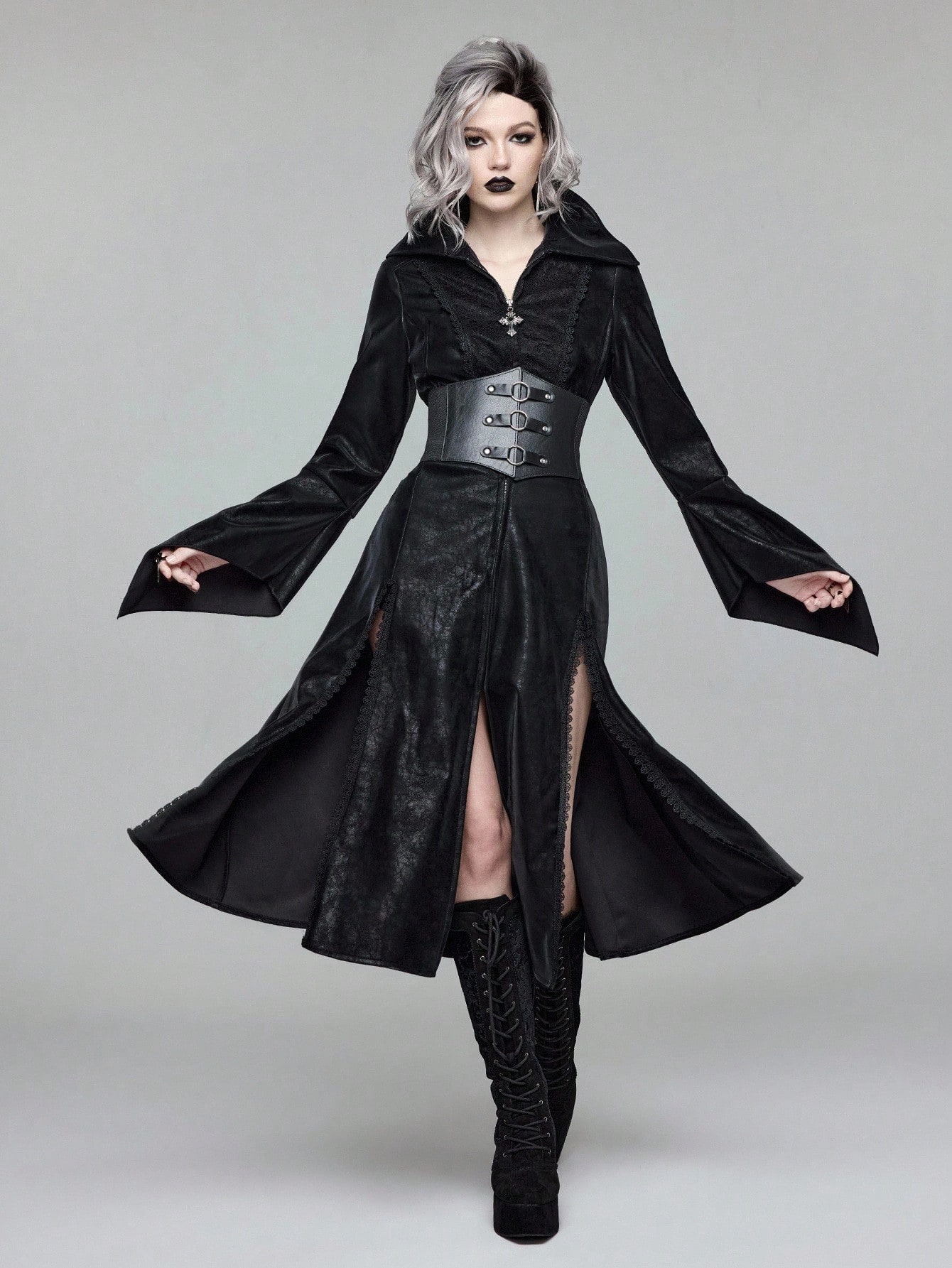 EDITION Giacca lunga con spacco alto, colletto alto, in stile gotico vintage, con contrasto di pizzo jacquard e PU, adatta a stile vampiresco, per donne