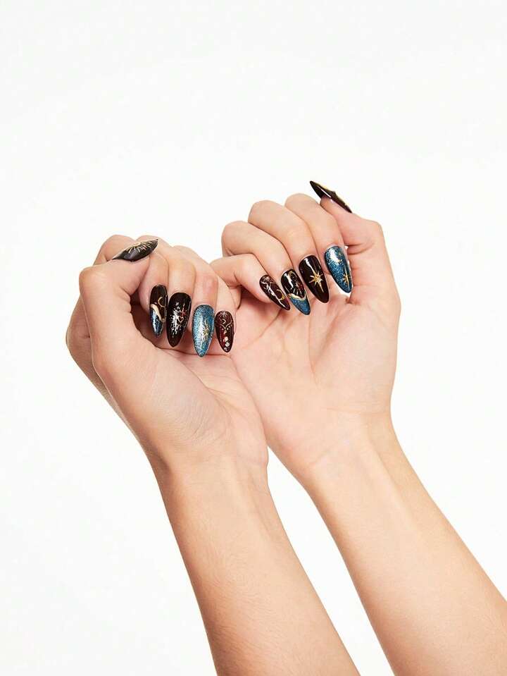 Fairycore 10 pezzi Unghie finte fatte a mano con stelle con 3 pezzi di adesivi doppi, unghie false con motivi occhi di gatto e cartoni animati colorati, perfette per feste di vacanza, balli e uso quotidiano.