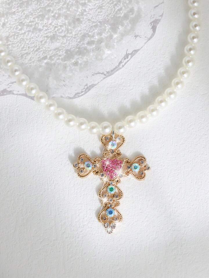 Fairycore 1 pezzo elegante collana di perle con ciondolo a croce e strass, adatta per luso quotidiano