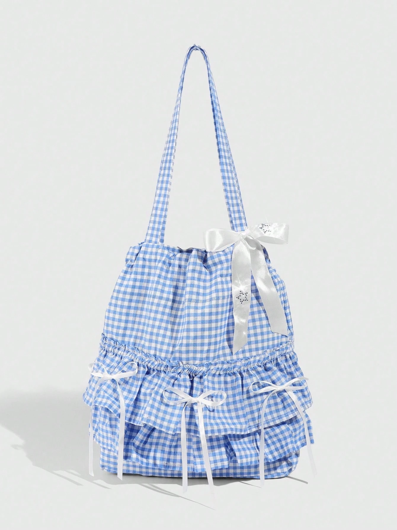 Fairycore 1 pezzo Borsa a spalla da donna con fiocco in stile dolce a quadri blu, borsa a tracolla con decorazione floreale a strati, adatta per il ritorno a scuola