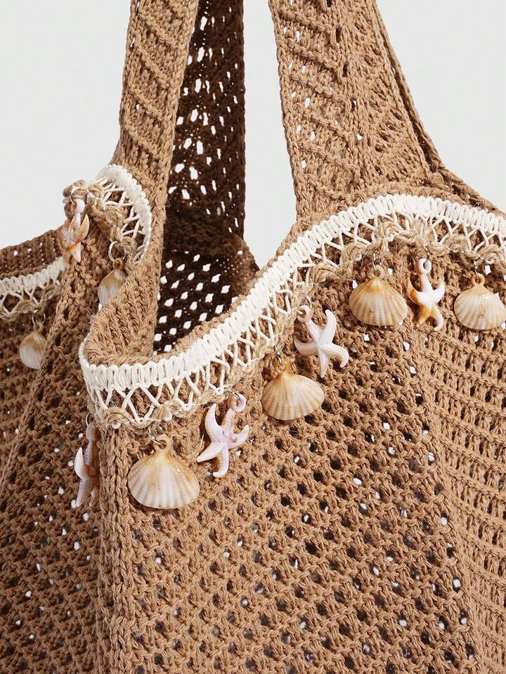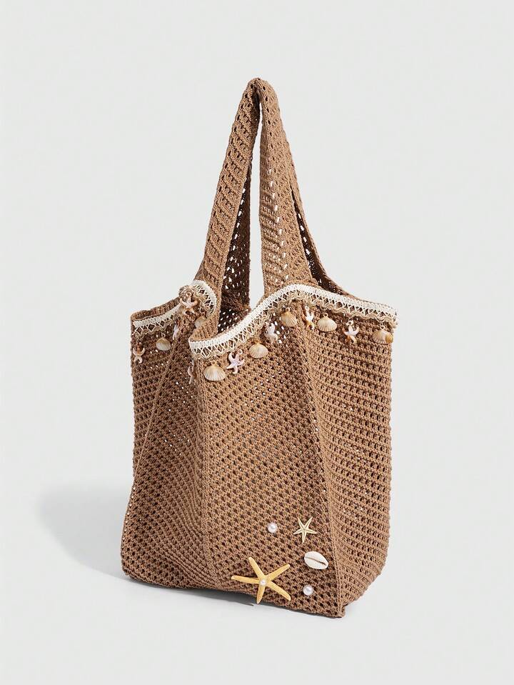 Fairycore 1 pezzo Borsa a spalla da donna stile resort tropicale, intrecciata, cava, color cachi, con grande capacità