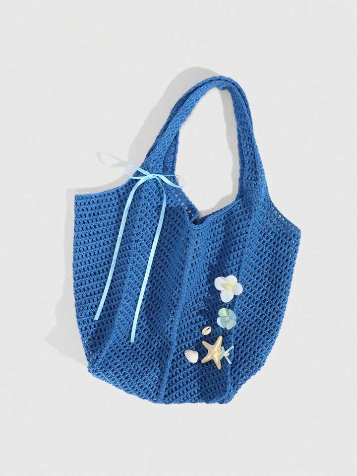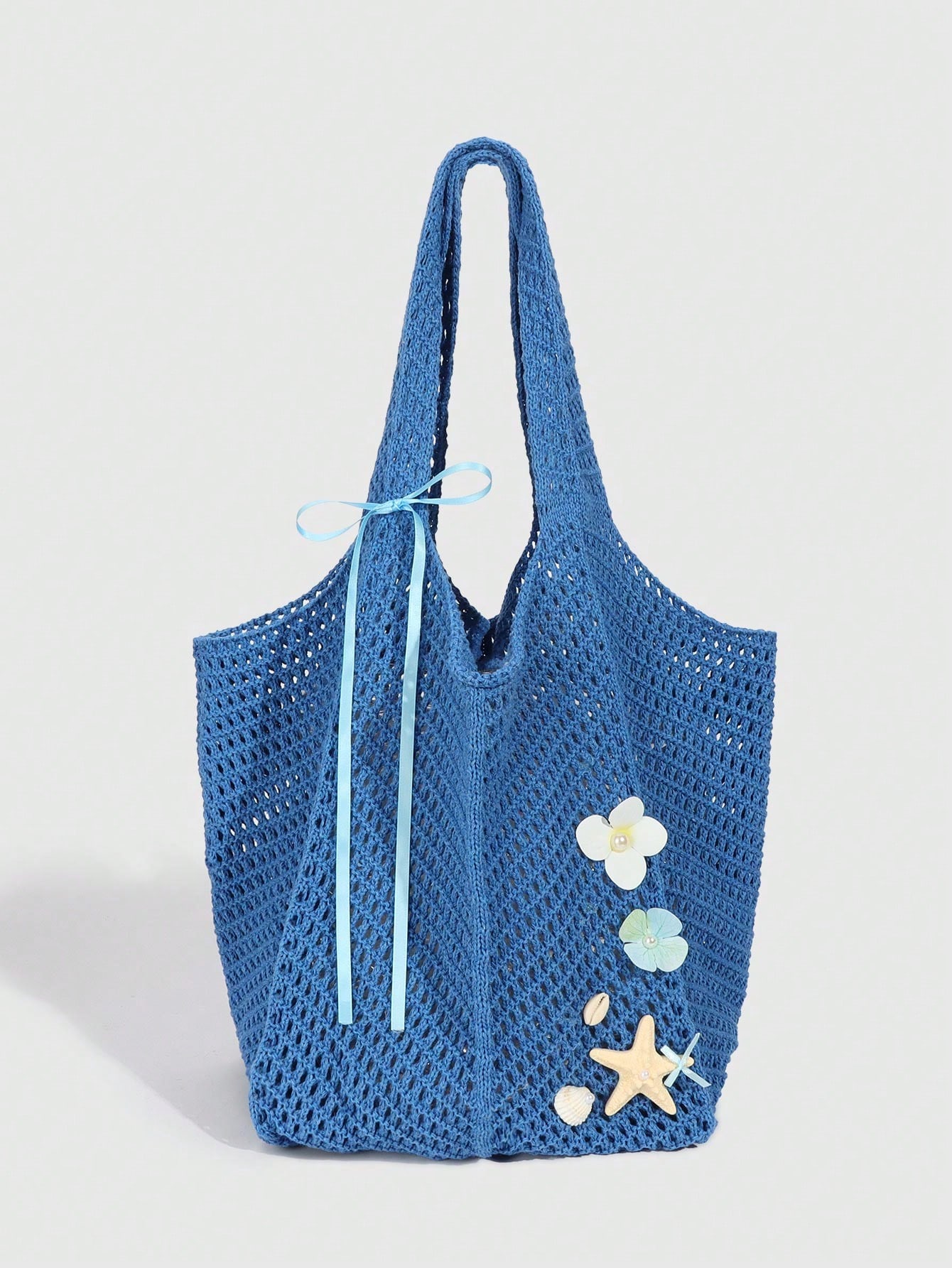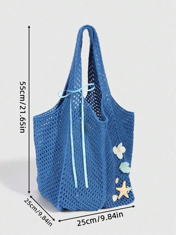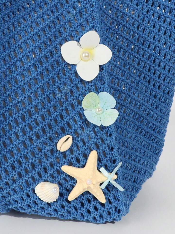 Fairycore 1 pezzo Borsa a spalla intrecciata da donna in stile resort oceanico tropicale, con decorazioni a conchiglia, stella marina e fiore, con grande capacità