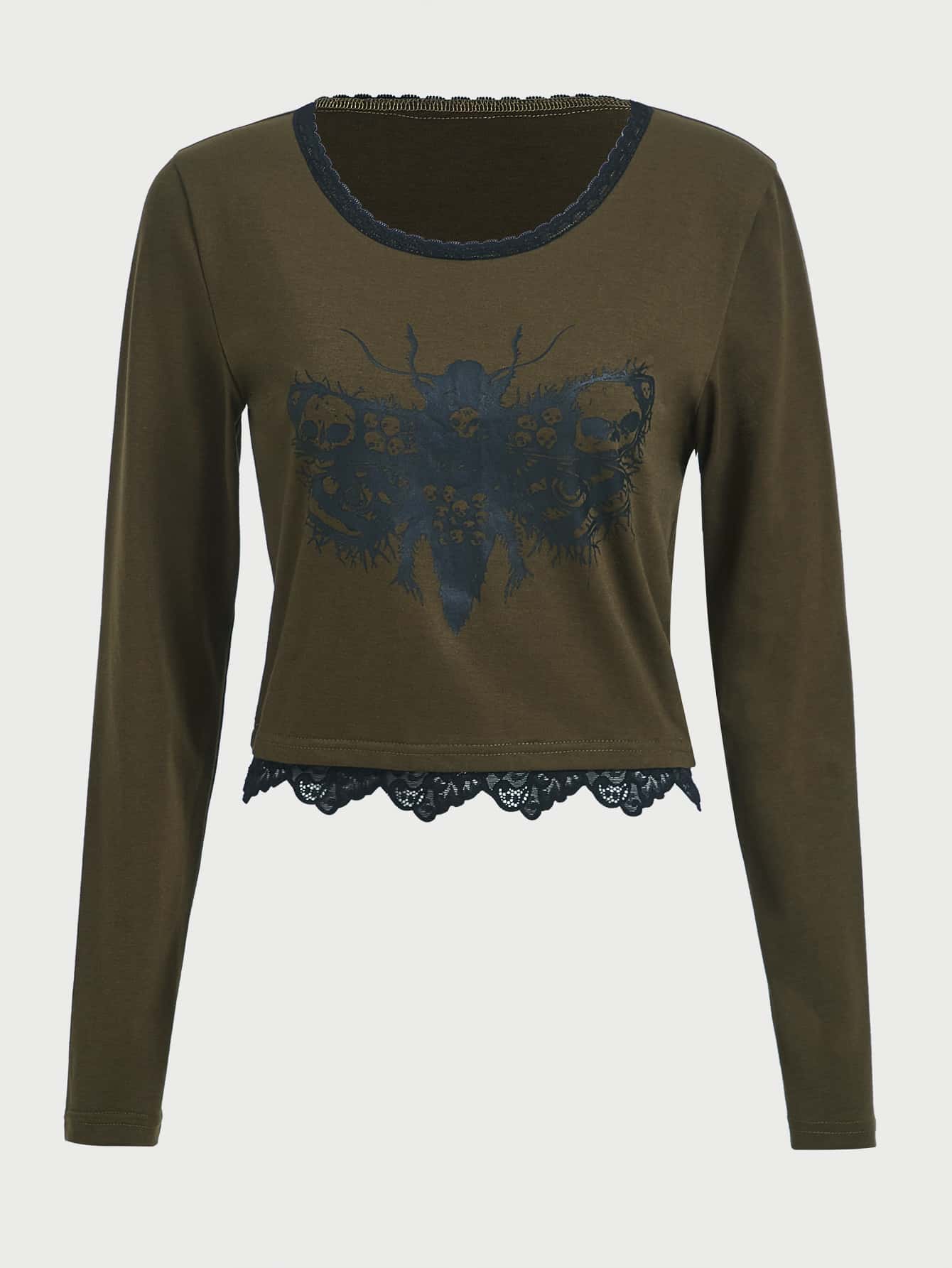 Fairycore Maglietta con stampa farfalla pizzo a contrasto