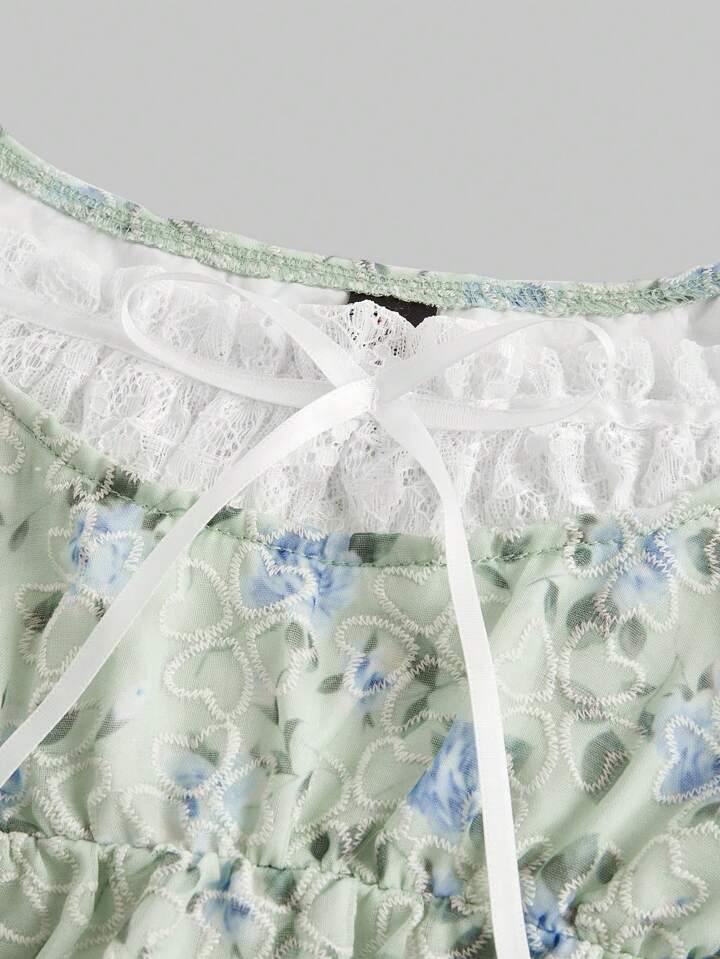Fairycore Vestito stile Mori Girl con motivo floreale ditsy, con inserti in pizzo con volant e fiocco anteriore, senza maniche, linea ad A, adatto per primavera ed estate