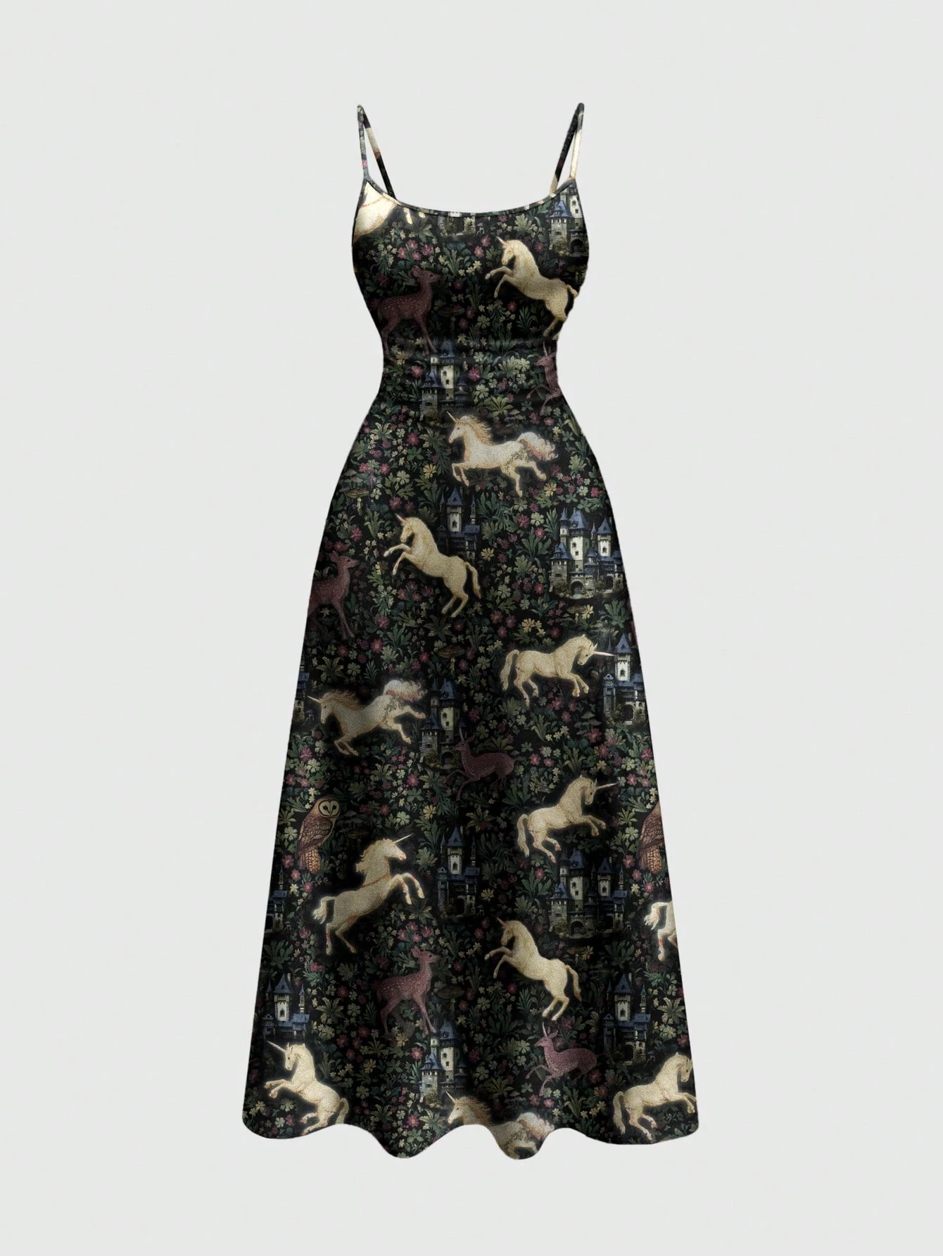 Fairycore Elegante abito da donna con motivi floreali, animali come gatti e gufi, e volant per resort di lusso, dal design misterioso e scuro