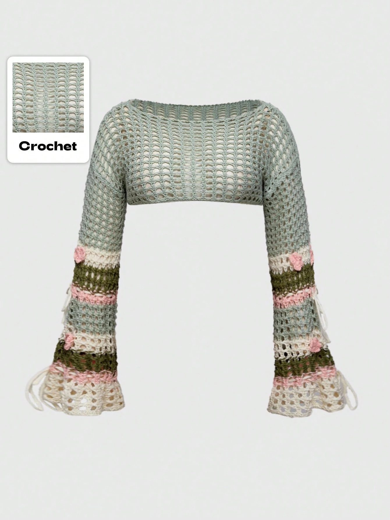 Fairycore Maglione verde a maniche lunghe con patchwork in maglia a rete, stile Mori, stile Mori Kei, a righe e floreale, taglie comode, Maglione a maniche lunghe da donna stile sottoculturaautunnoinverno, taglie comode