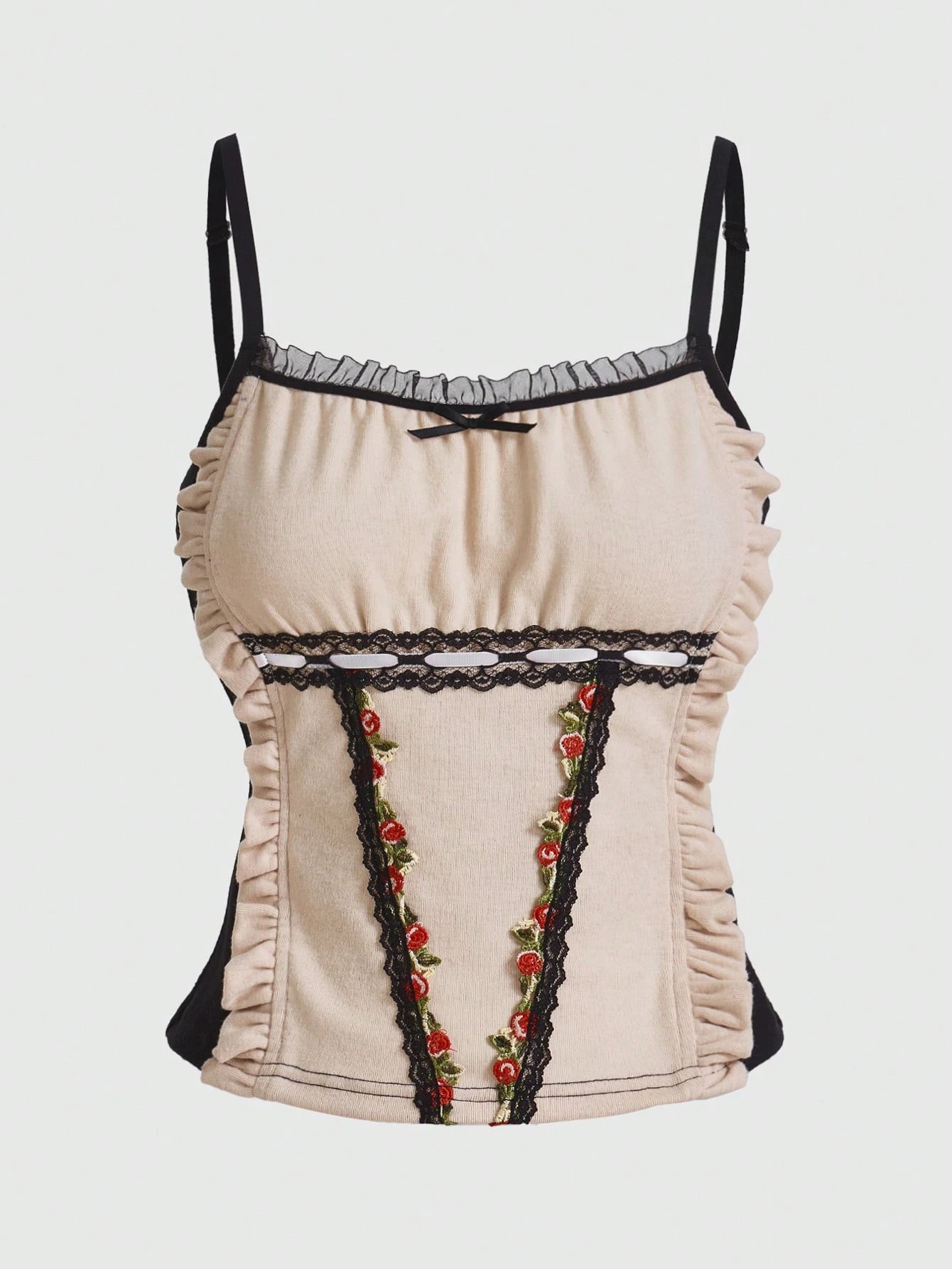 Fairycore Top bretelle sottile con ricamo floreale pizzo a contrasto