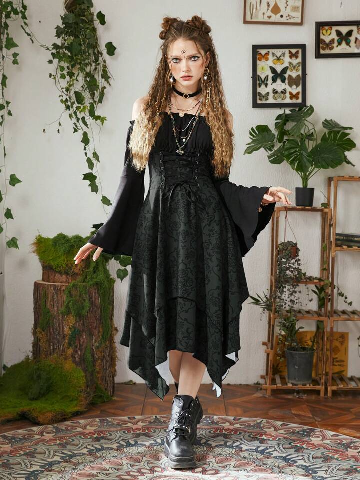 Fairycore Abiti con stampa floreale con lacci frontale maniche a campana con orlo asimmetrico
