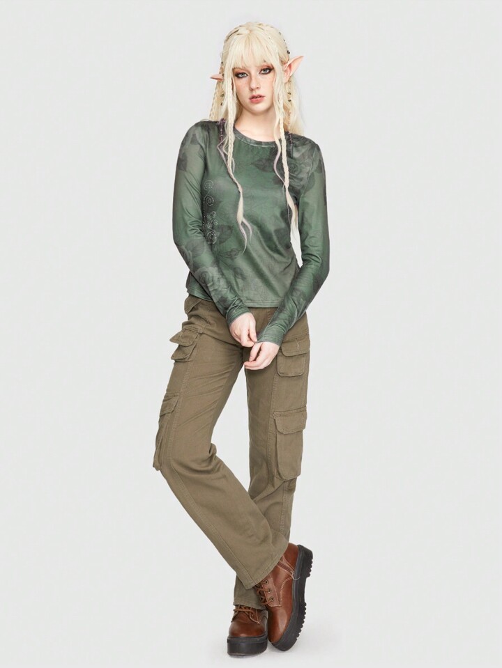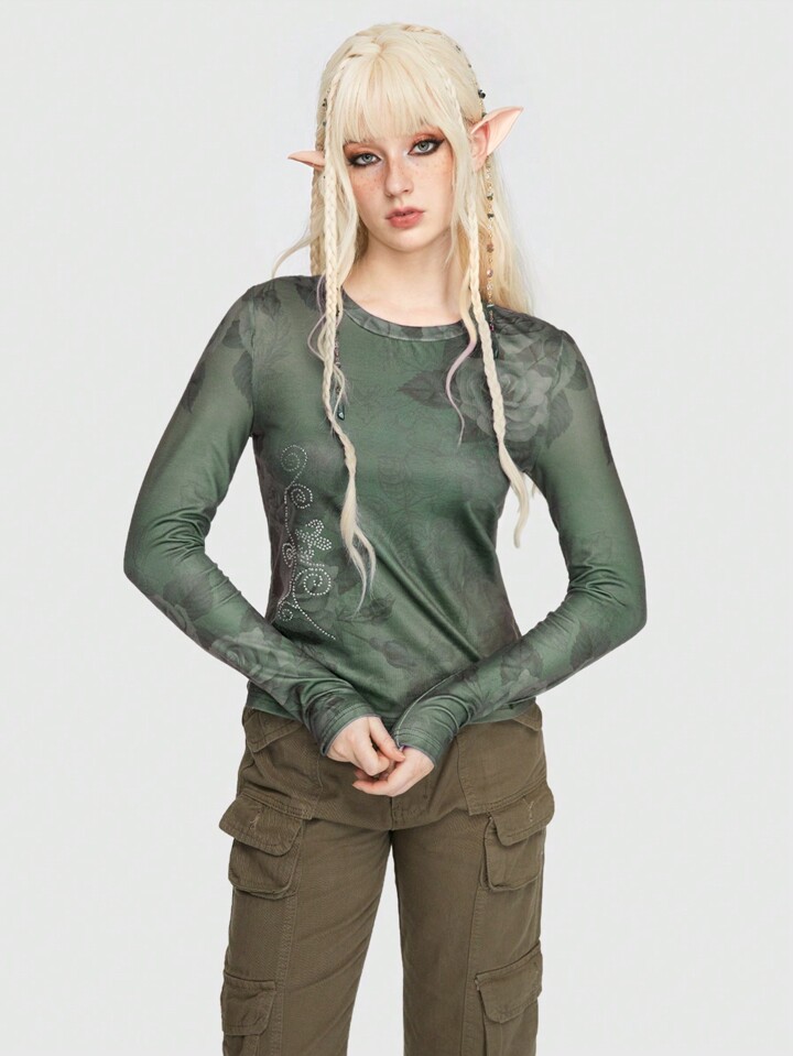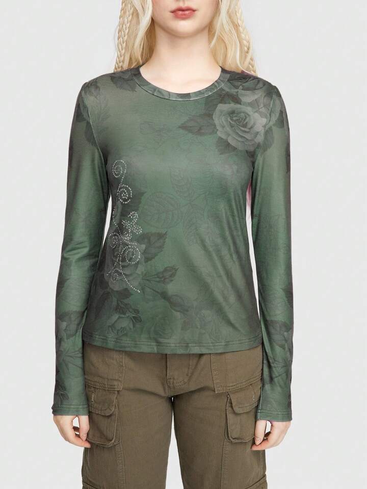Fairycore Maglietta A Maniche Lunghe Con Stampa Floreale, Collo Rotondo