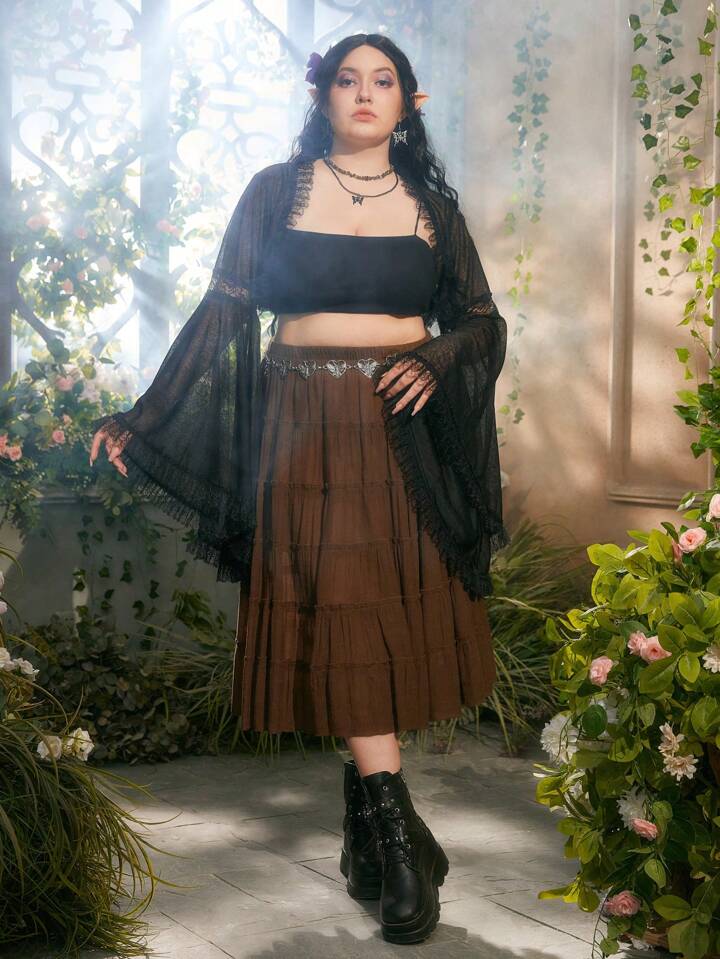 Fairycore Taglie Forti Top corto pizzo a contrasto maniche svasata aperto davanti