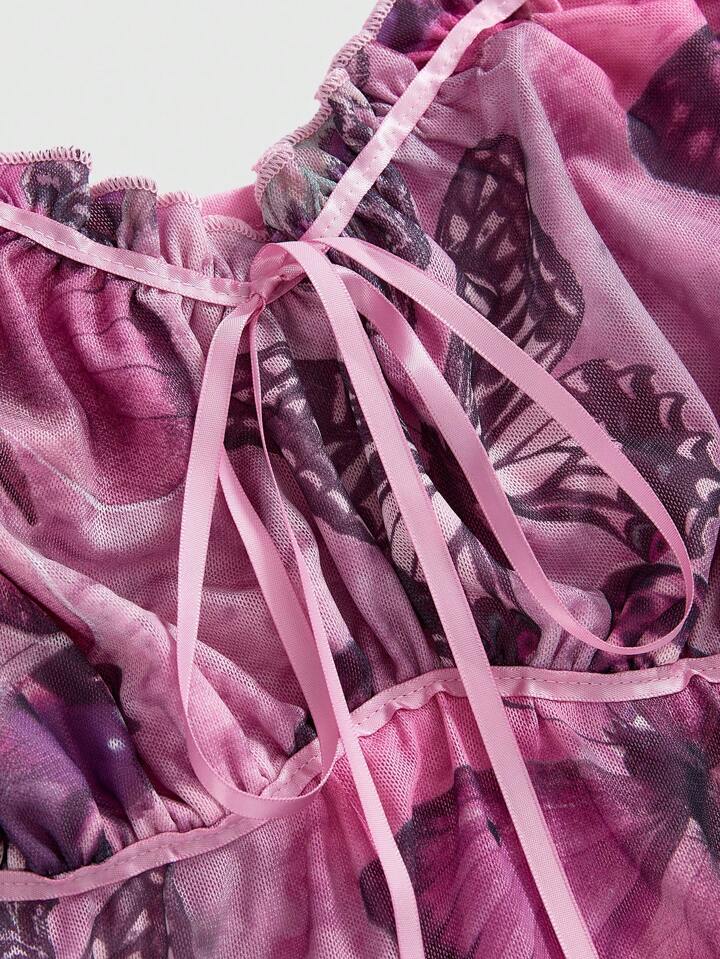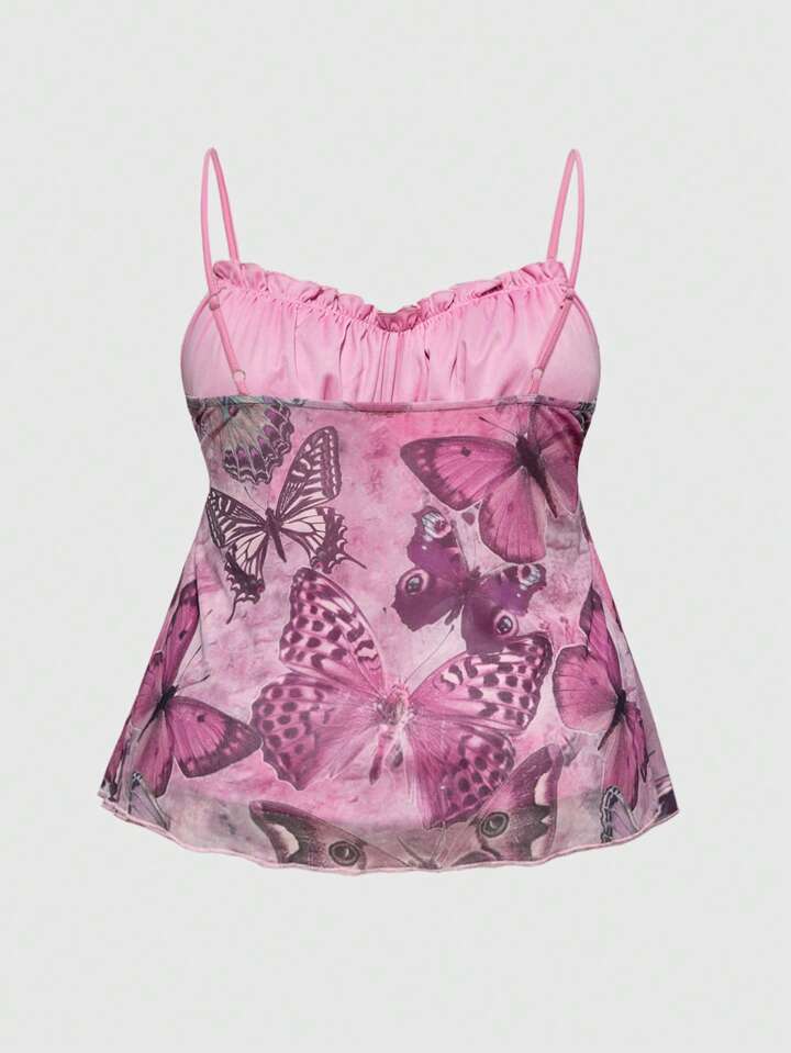Fairycore Canottiera da donna taglie forti con stampa a farfalla, orlo arricciato annodata