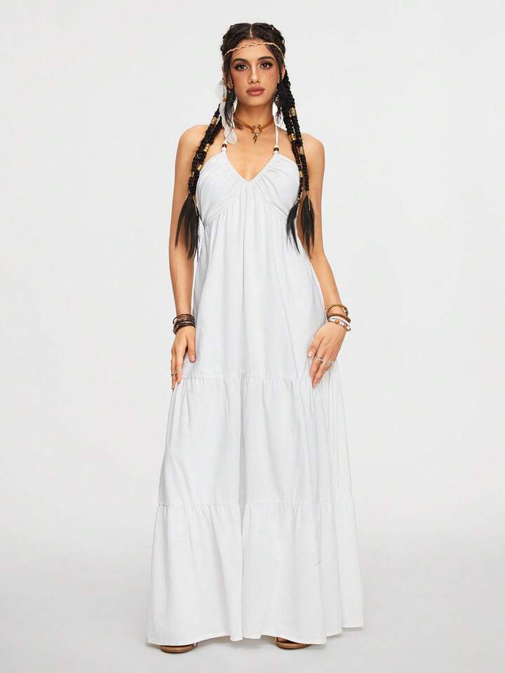 Fairycore Sexy Vintage Vacanza Al Mare Vestito lungo a linea A con scollo alla schiena Halter e fiocco per le donne