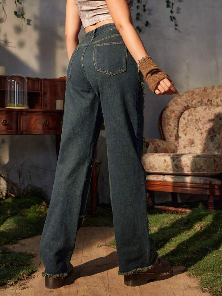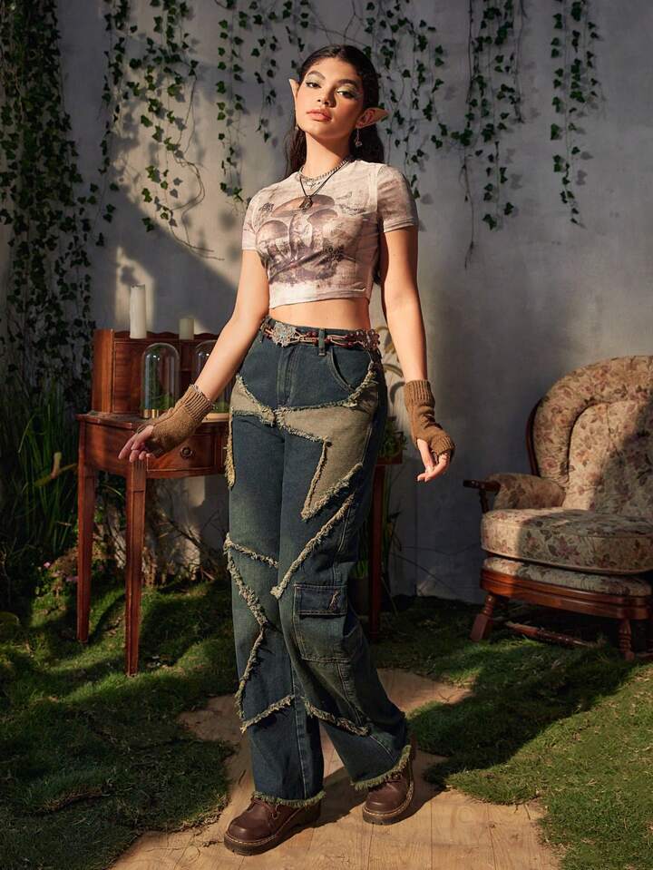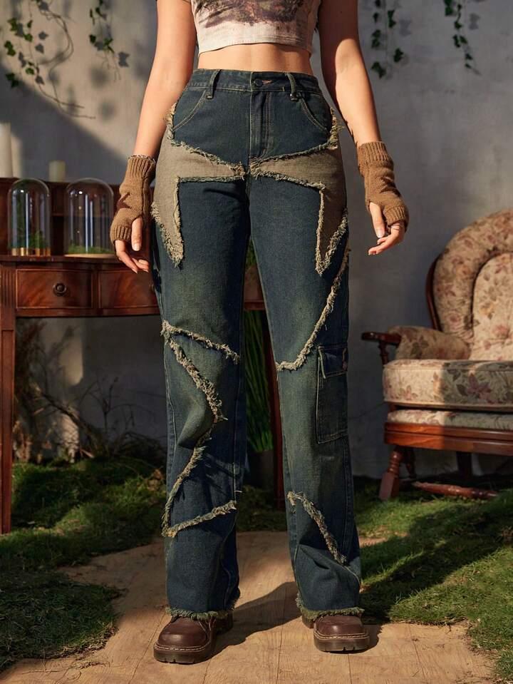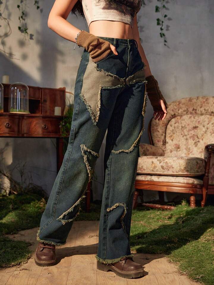 Fairycore Jeans a gamba dritta con design a stelle, blocchi di colore e orlo grezzo, per la scuola