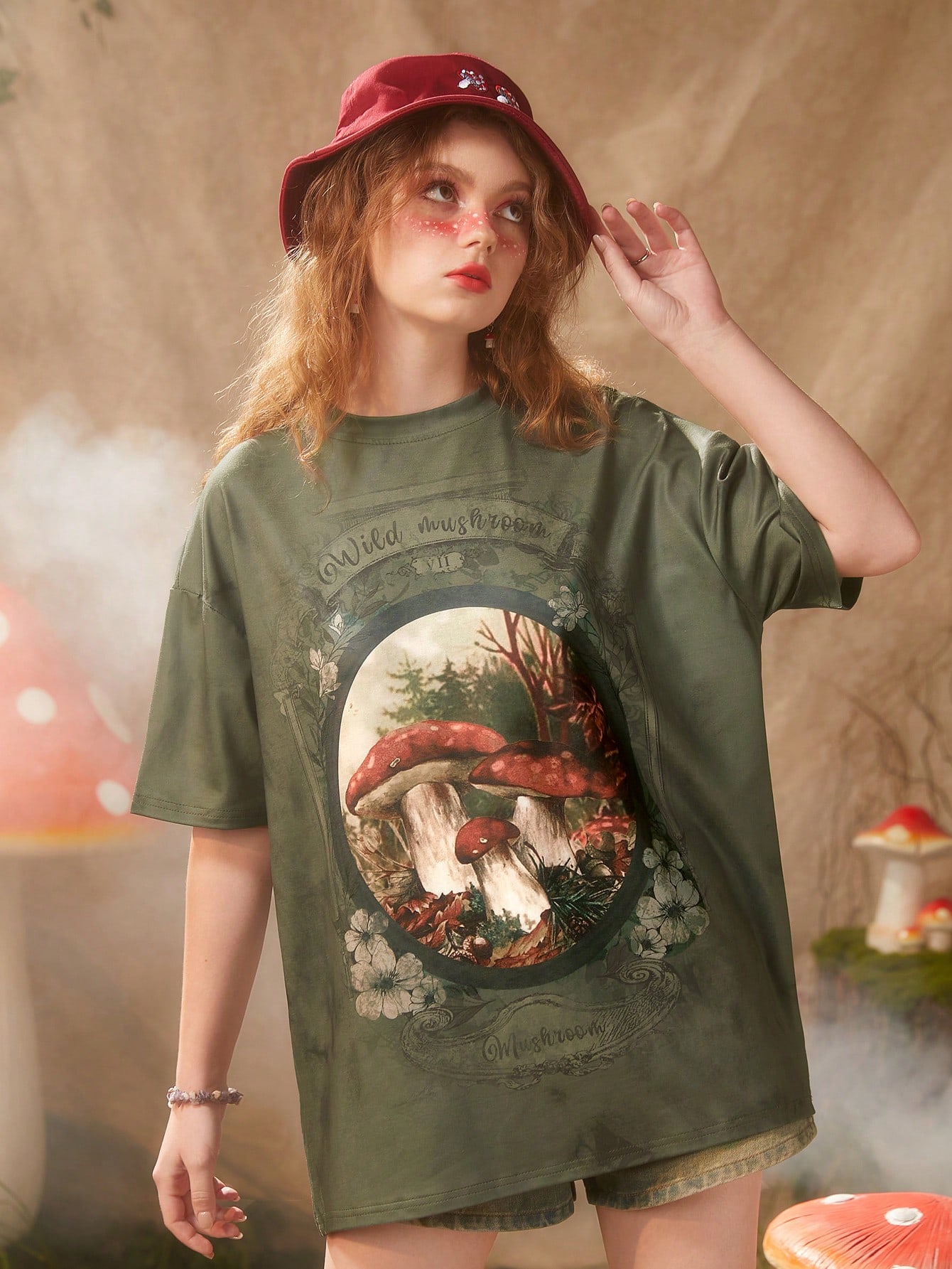 Fairycore Maglietta con spalla cadenti tie dye con stampa funghi