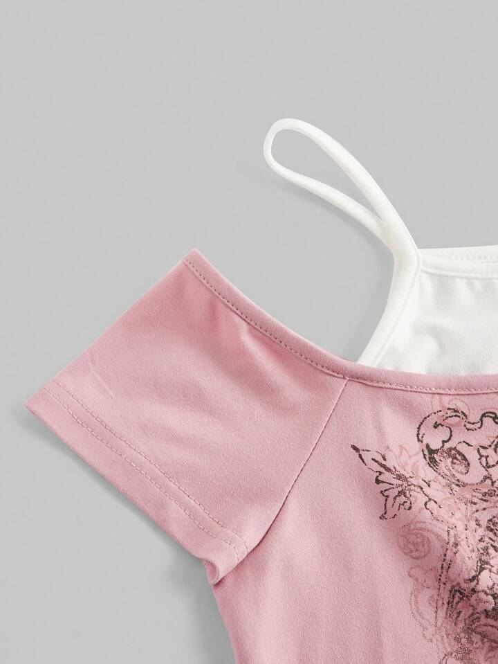 Fairycore Maglietta aderente da donna 2 in 1, con spalla obliqua, decorata con strass e motivo a croce vintage stile Y2K degli anni 2000
