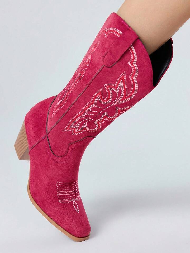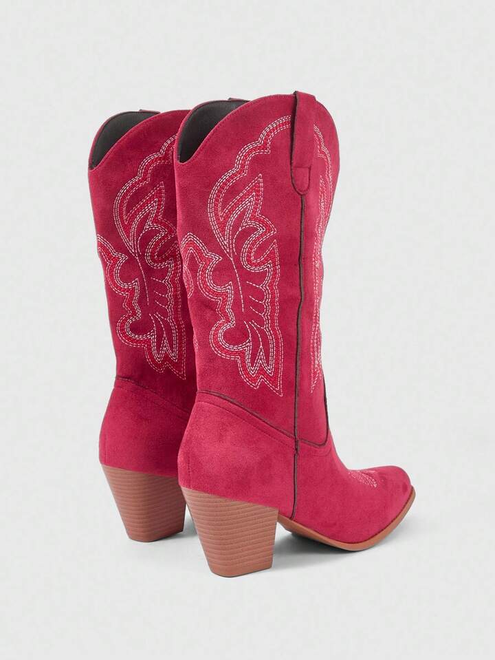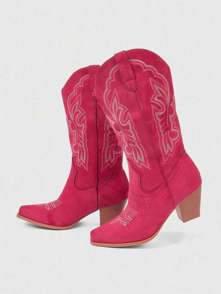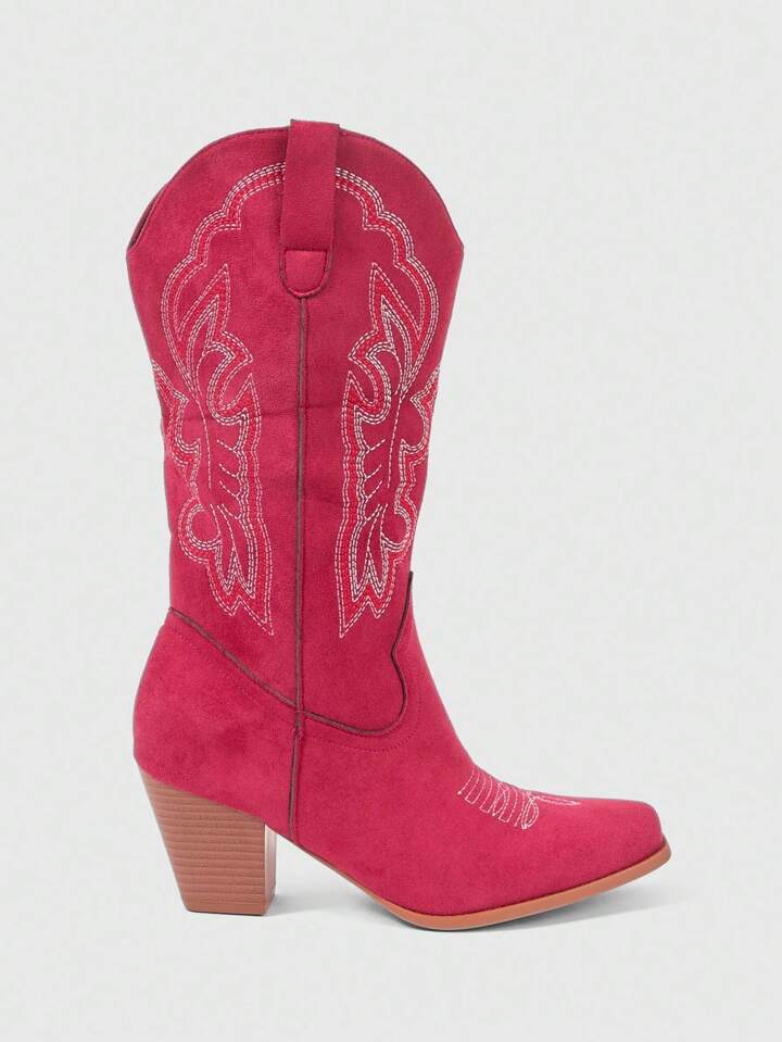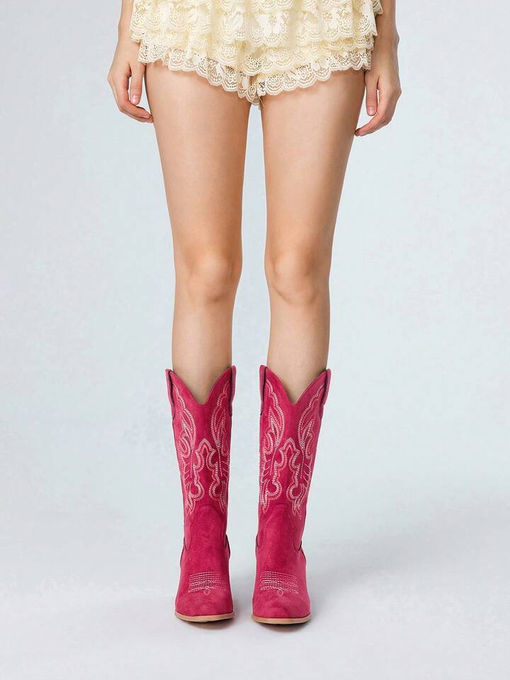 Fairycore Stivali da cowboy da donna, stile casual all'aperto, stivali western rossi con ricamo, altezza metà polpaccio, adatti per primavera/autunno, colore rosa