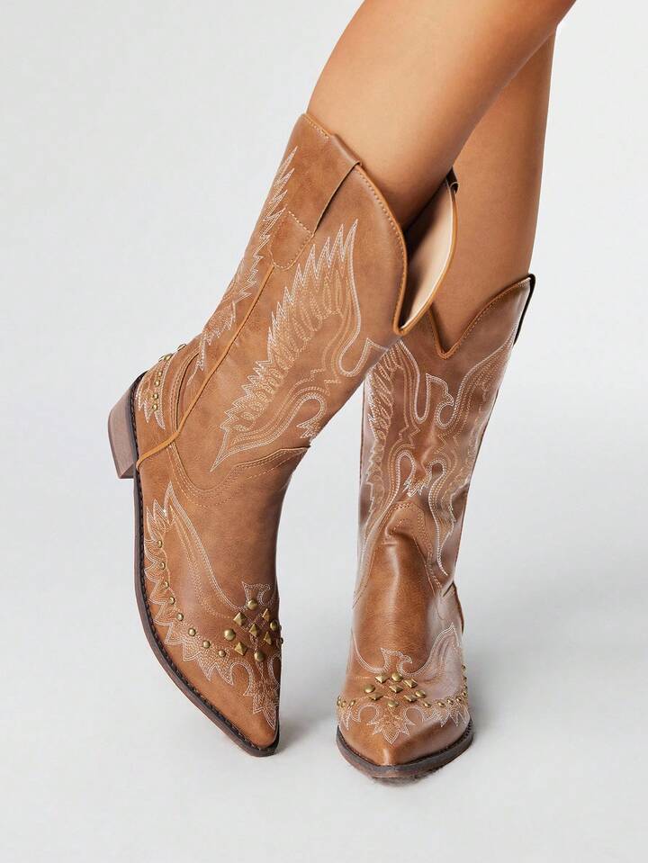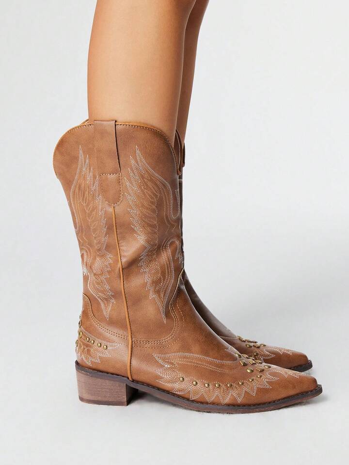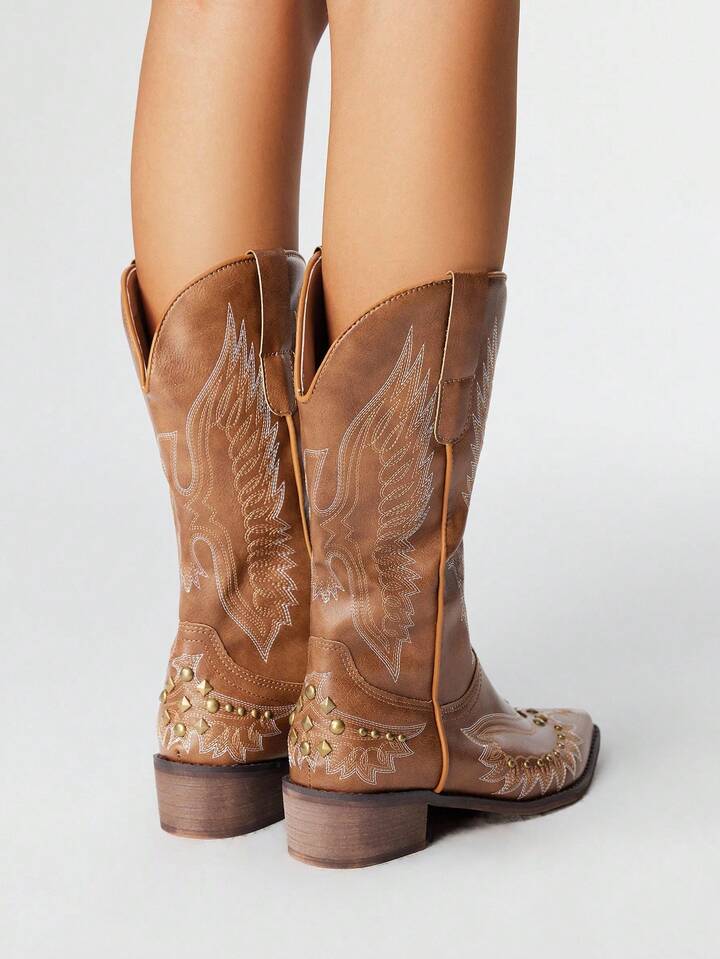 Fairycore Stivali western da donna in stile punk gotico scuro ricamati, stivali in pelle con borchie e tacco basso, color marrone, altezza polpaccio