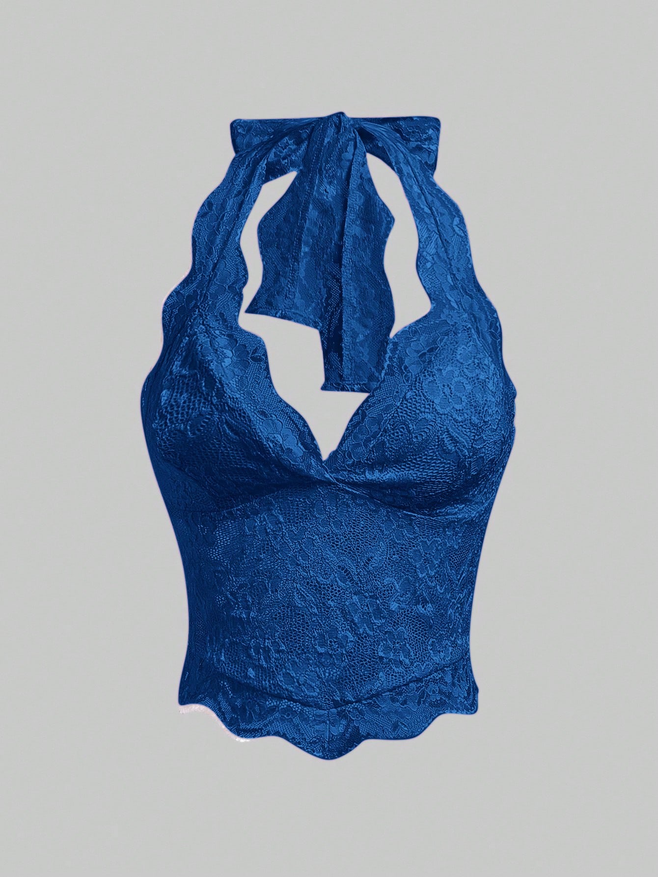 Top elegante e sexy da donna in pizzo monocolore con schiena scoperta e collo alla francese