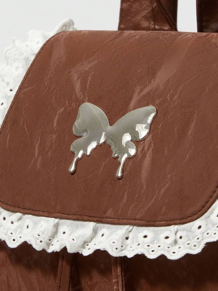 Fairycore Zaino da donna in stile moda con patchwork, ricamo e decorazione in metallo a fiocco, colore marrone