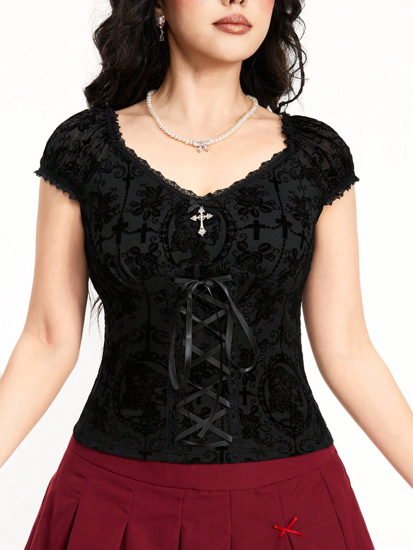 Fairycore Maglietta stile Palace Retrò da donna in tessuto flocked con fiocco e orlo in pizzo