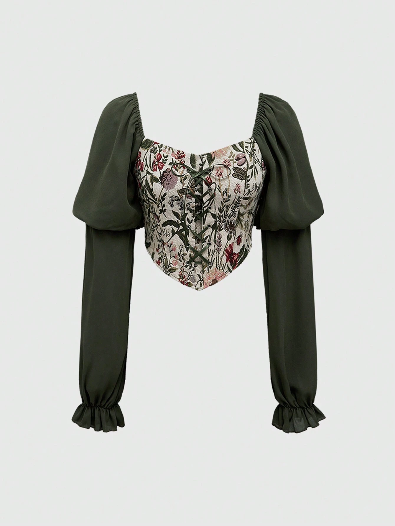 Fairycore Blusa floreale in jacquard patchwork da donna con stile retrò di palazzo
