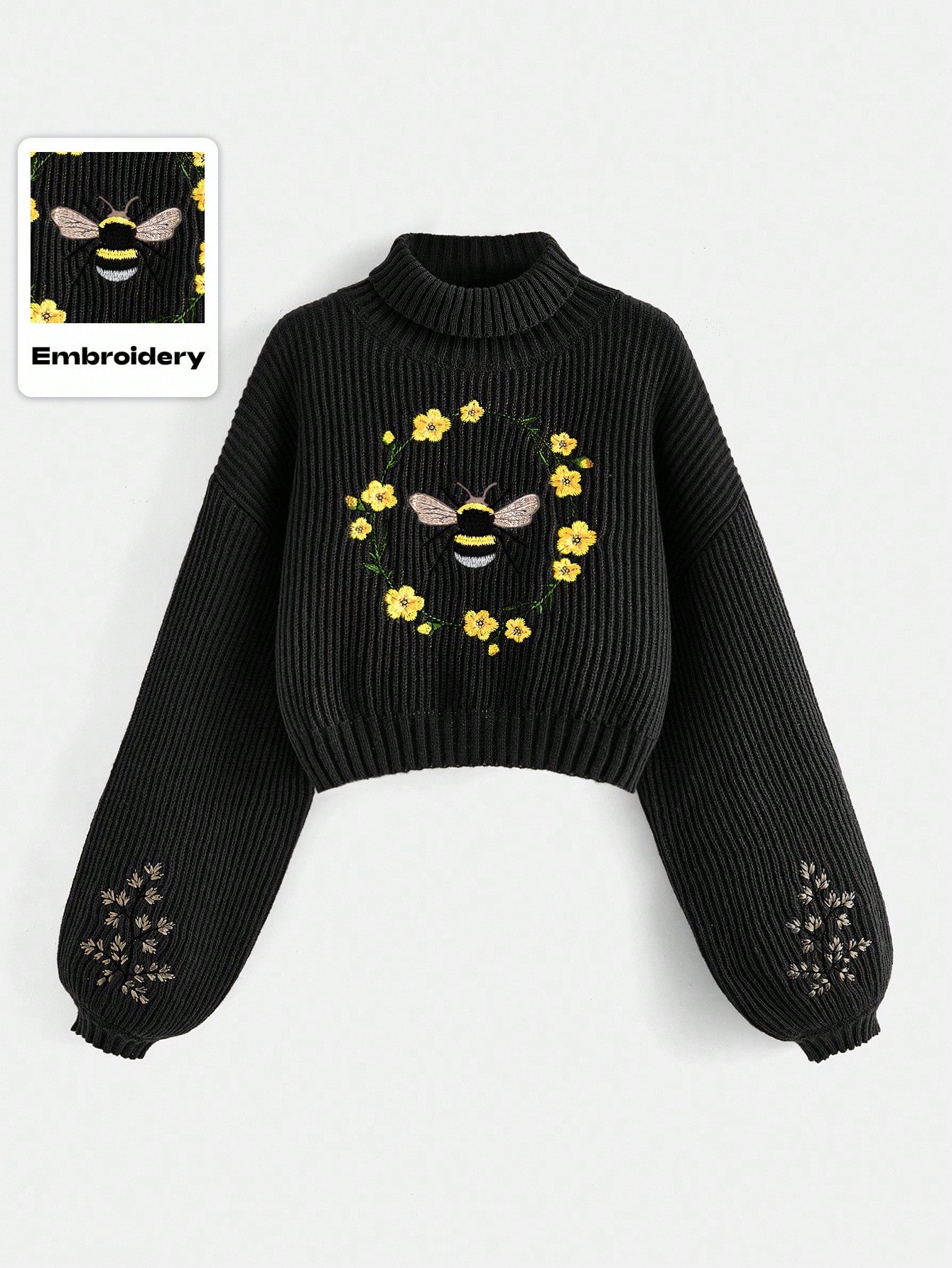 Fairycore Maglione con collo alto, maniche a lanterna e ricamo di api e fiori, adatto per la scuola, da donna