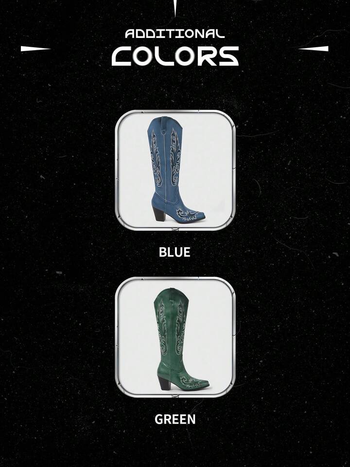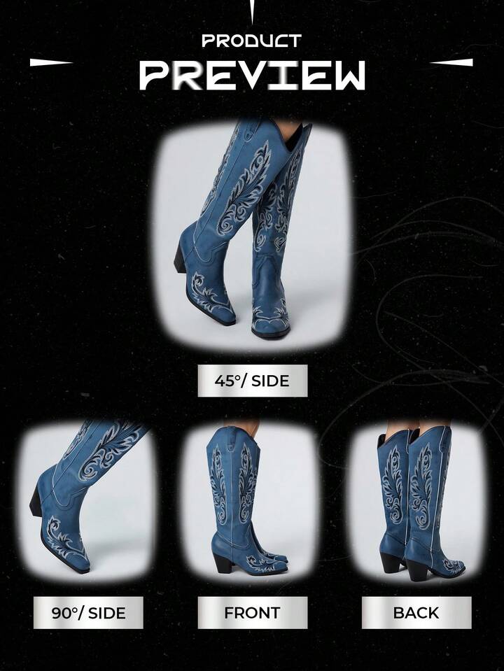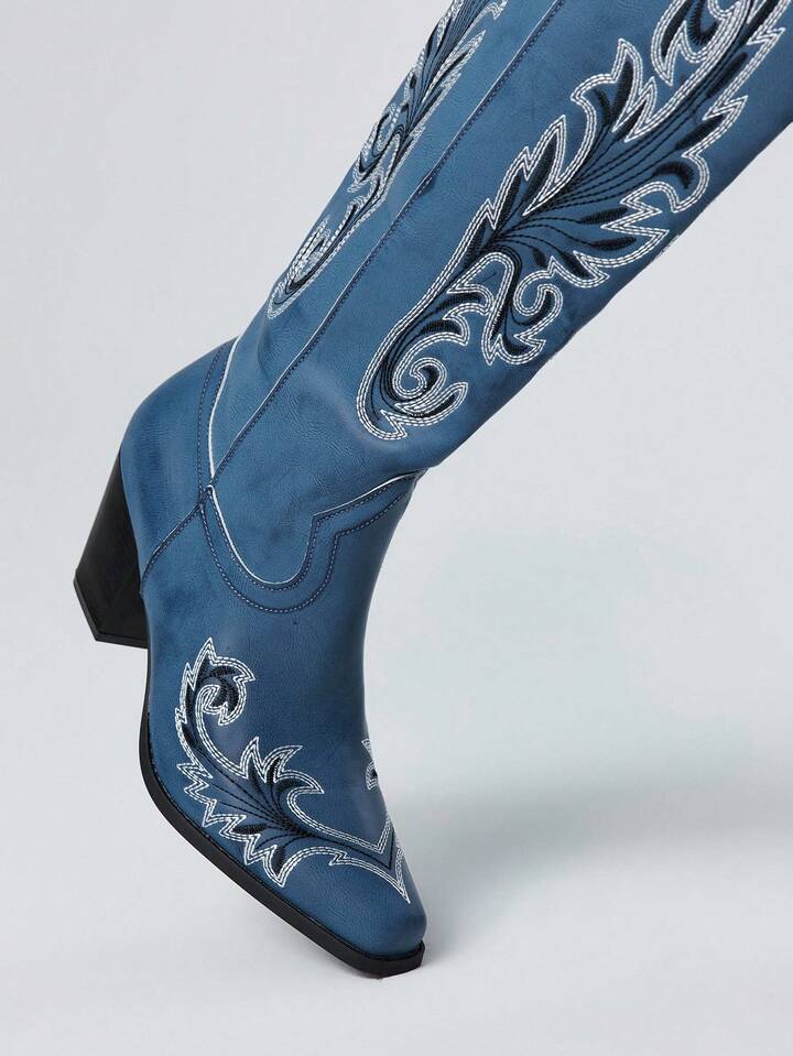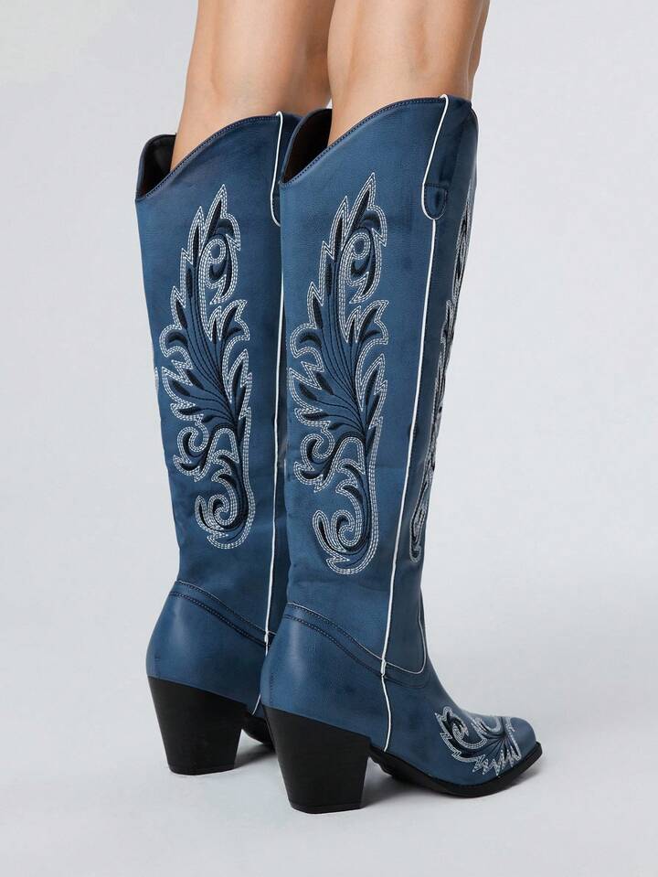 Fairycore Stivali da cowgirl da donna con chiusura a scorrimento, dettagli asimmetrici consumati, ricamo, stivali da equitazione occidentali alla moda, alti fino al ginocchio per uso esterno