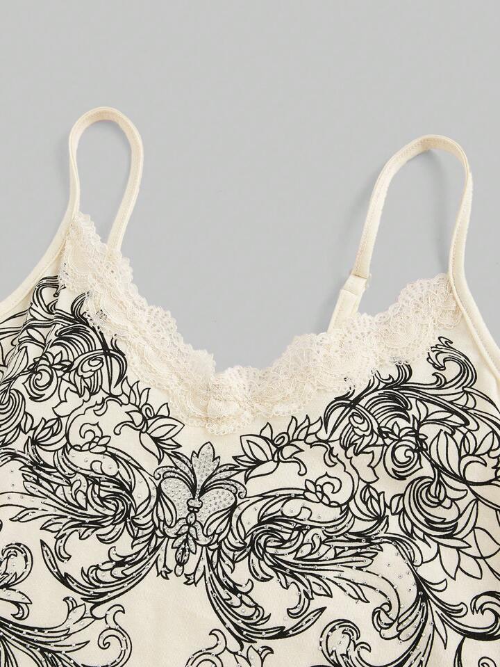 Fairycore Vestito da donna retrò con stampa floreale, con bordo in pizzo e decorazione di strass, con spalline sottili