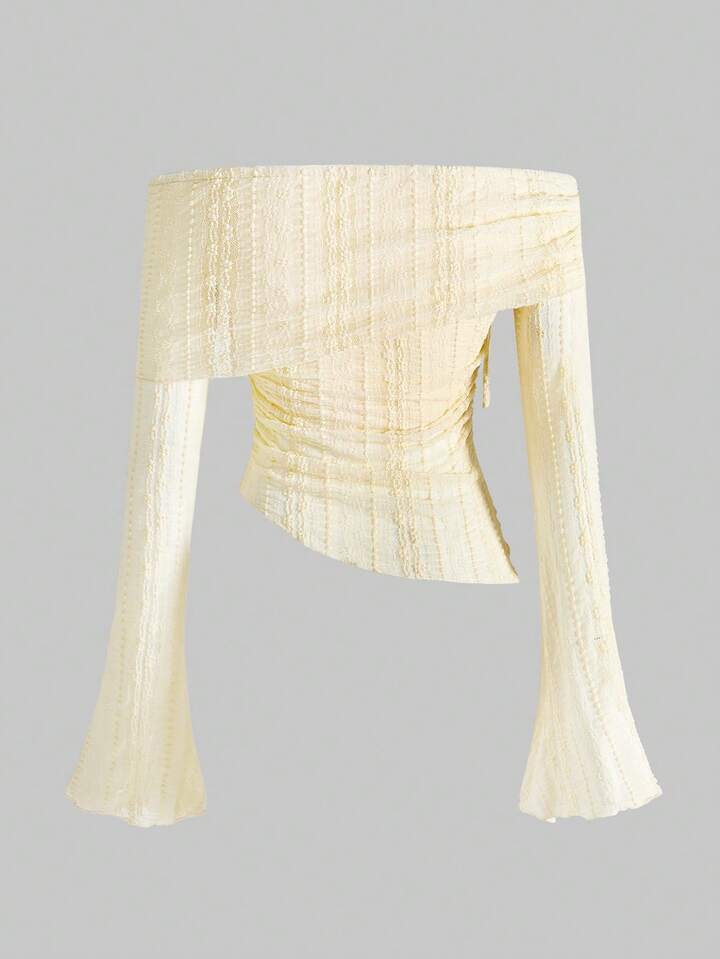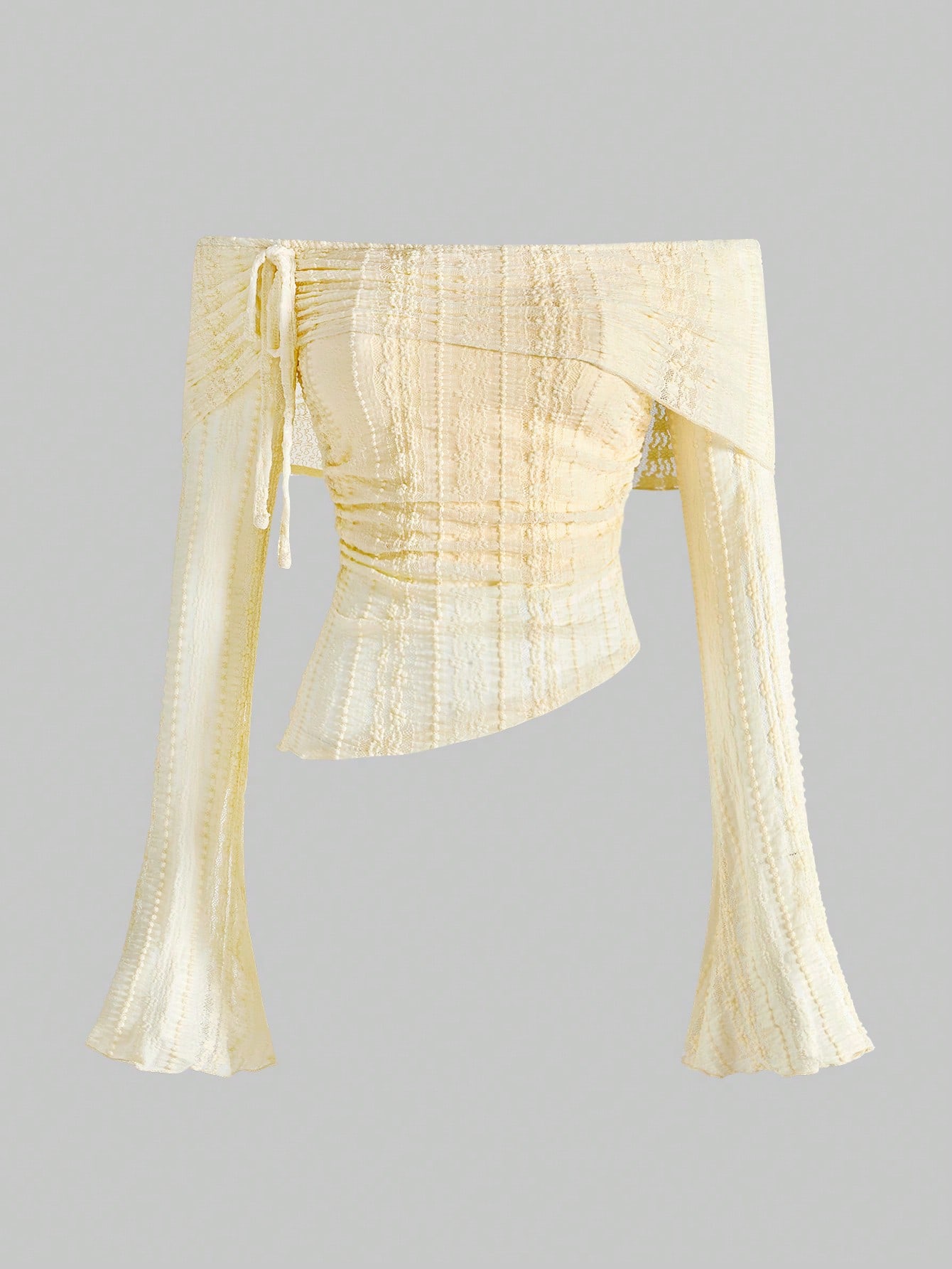 Fairycore Top a maniche lunghe con spalle scoperte, arricciature e maniche a campana in pizzo, stile Y2K