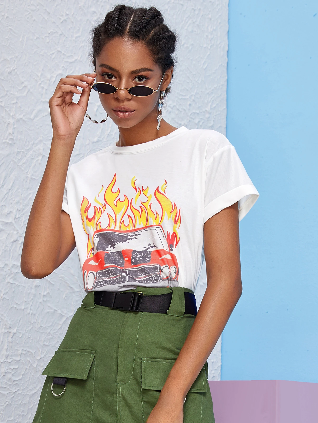 Maglietta con manica arrotolata e stampa auto e fuoco
