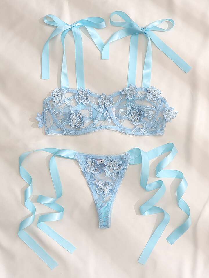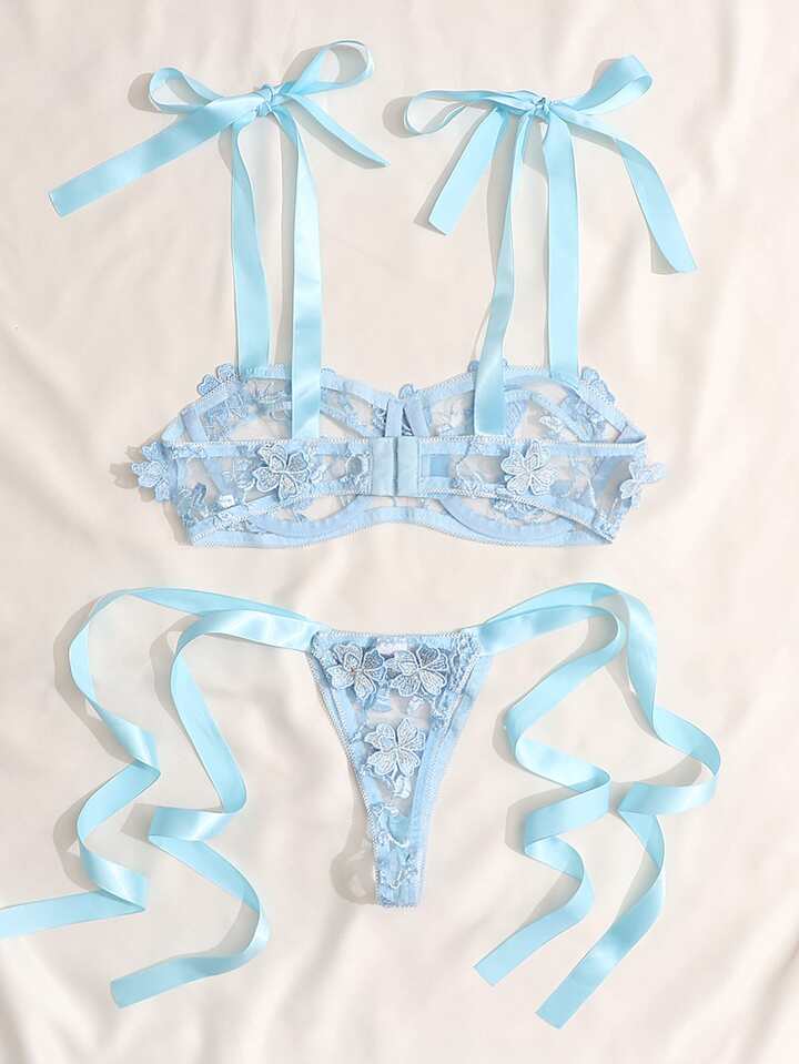 Set lingerie con ricamo floreale mesh con spalle annodate