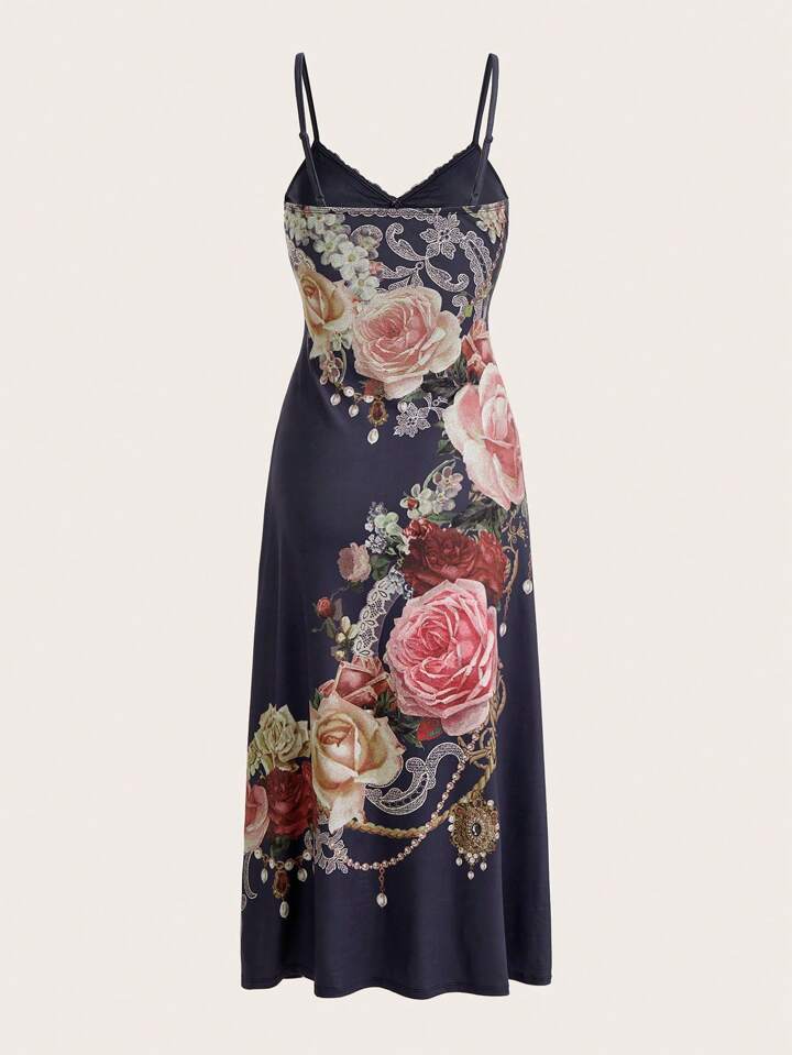 Abito con bretelle sottile con stampa floreale pizzo a contrasto