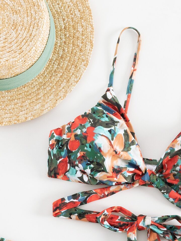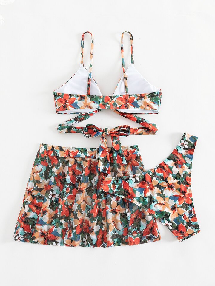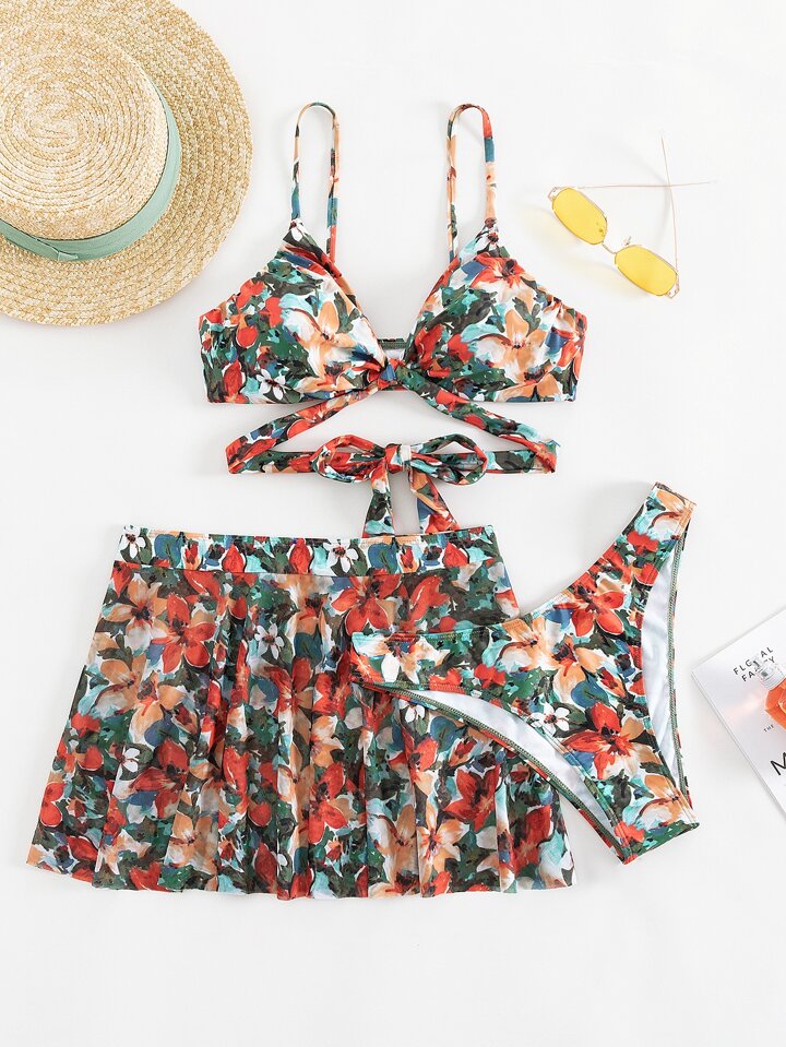 Set bikini da mare estivo con stampa floreale, nodo frontale e gonna da spiaggia.