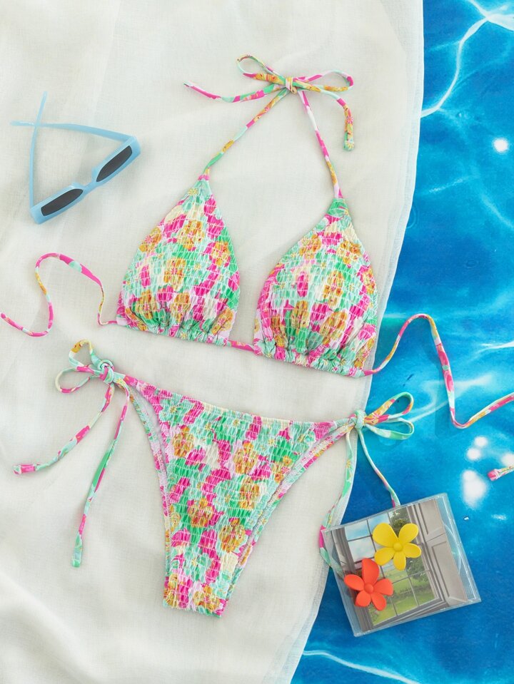 Insieme bikini estivo al triangolo con volant, stampa floreale e reggiseno a fascia con smock