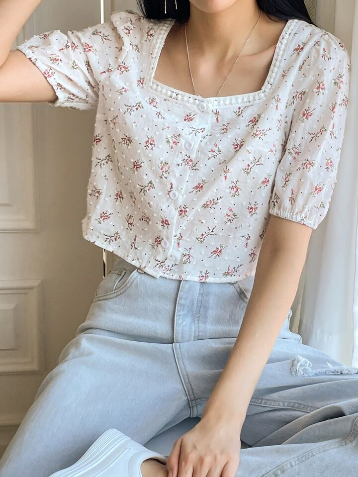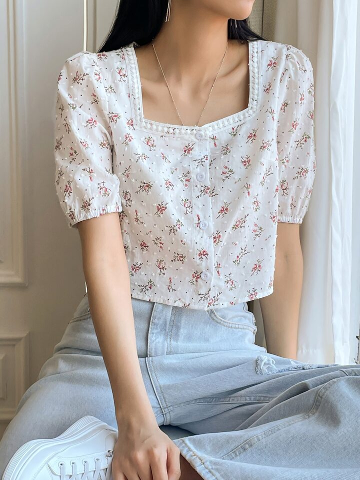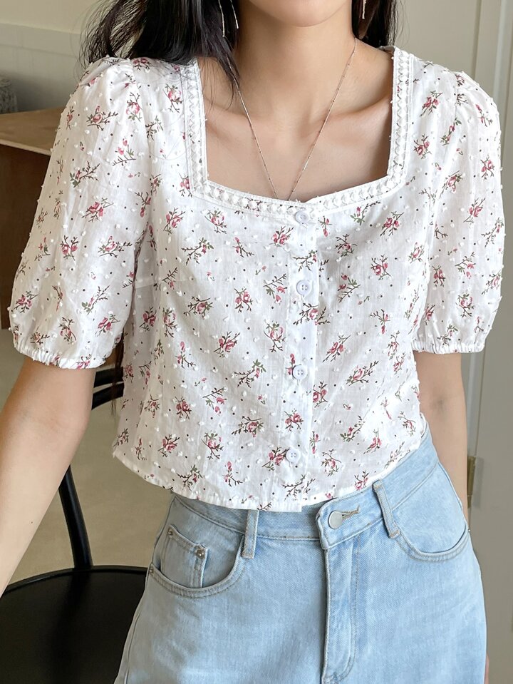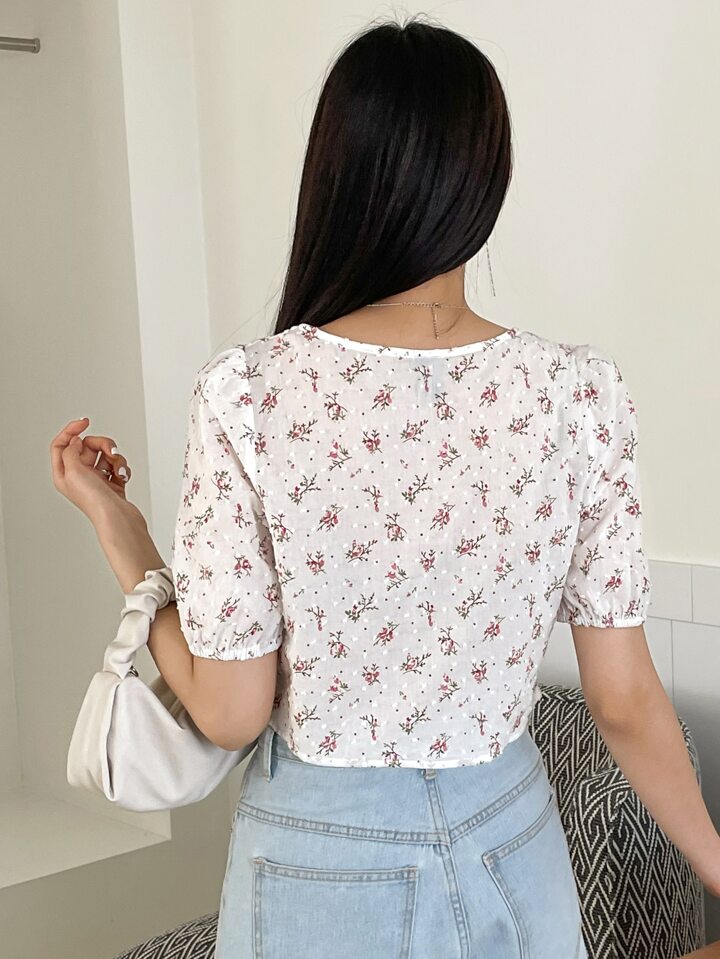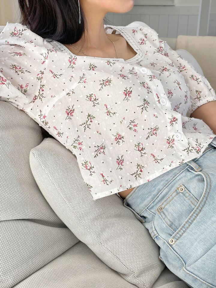Camicetta con stampa floreale con pois pannello in pizzo guipure con manica a sbuffo