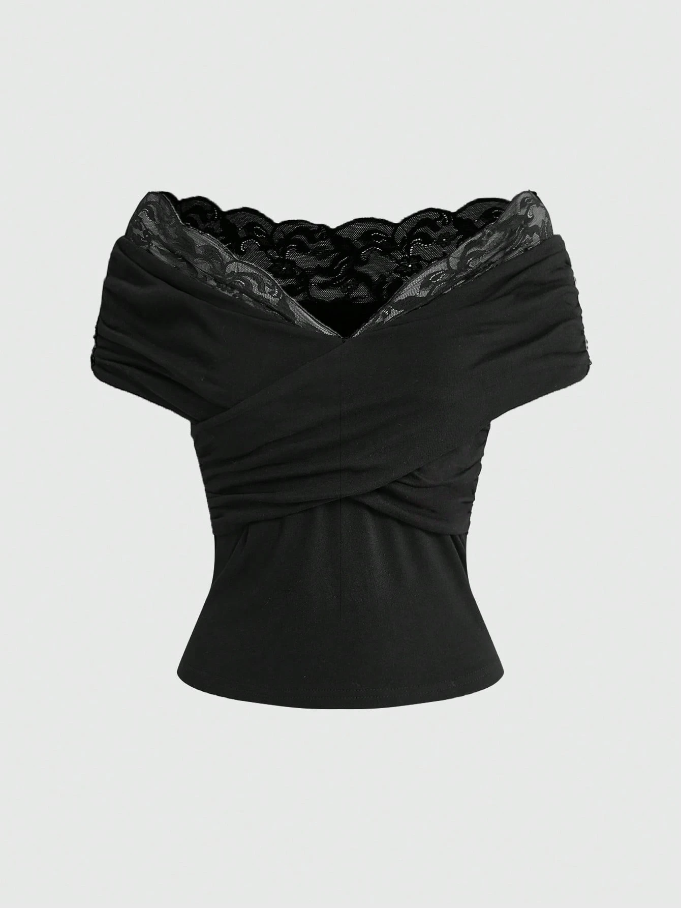 Blusa da donna con scollo a V e spalle scoperte, con inserti in pizzo e arricciature