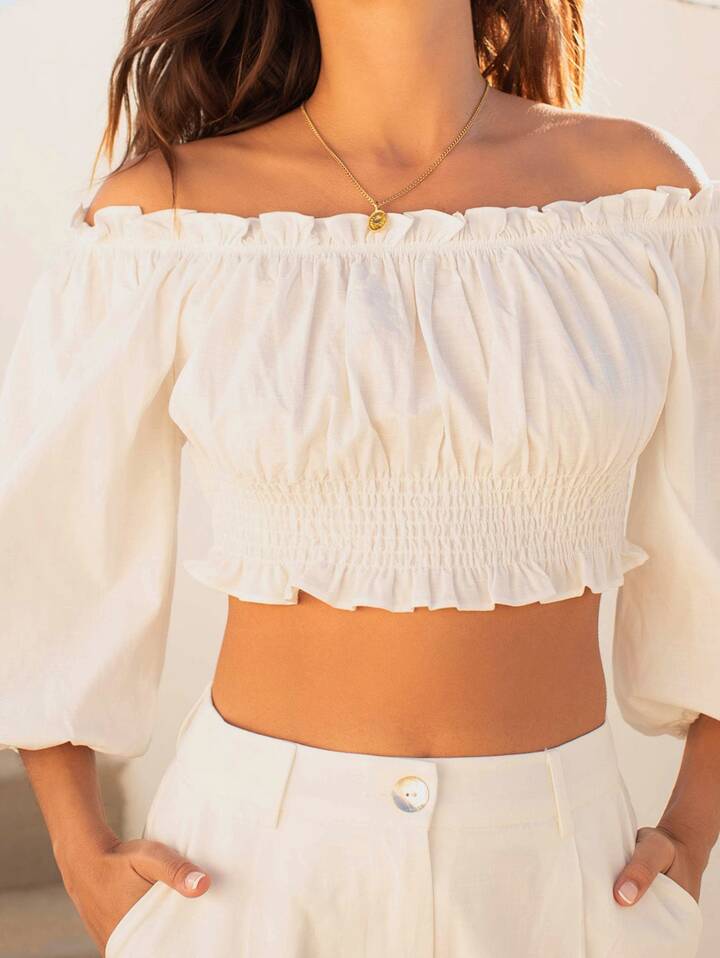 Top corto volant con spalle scoperte manica a lanterna arricciato